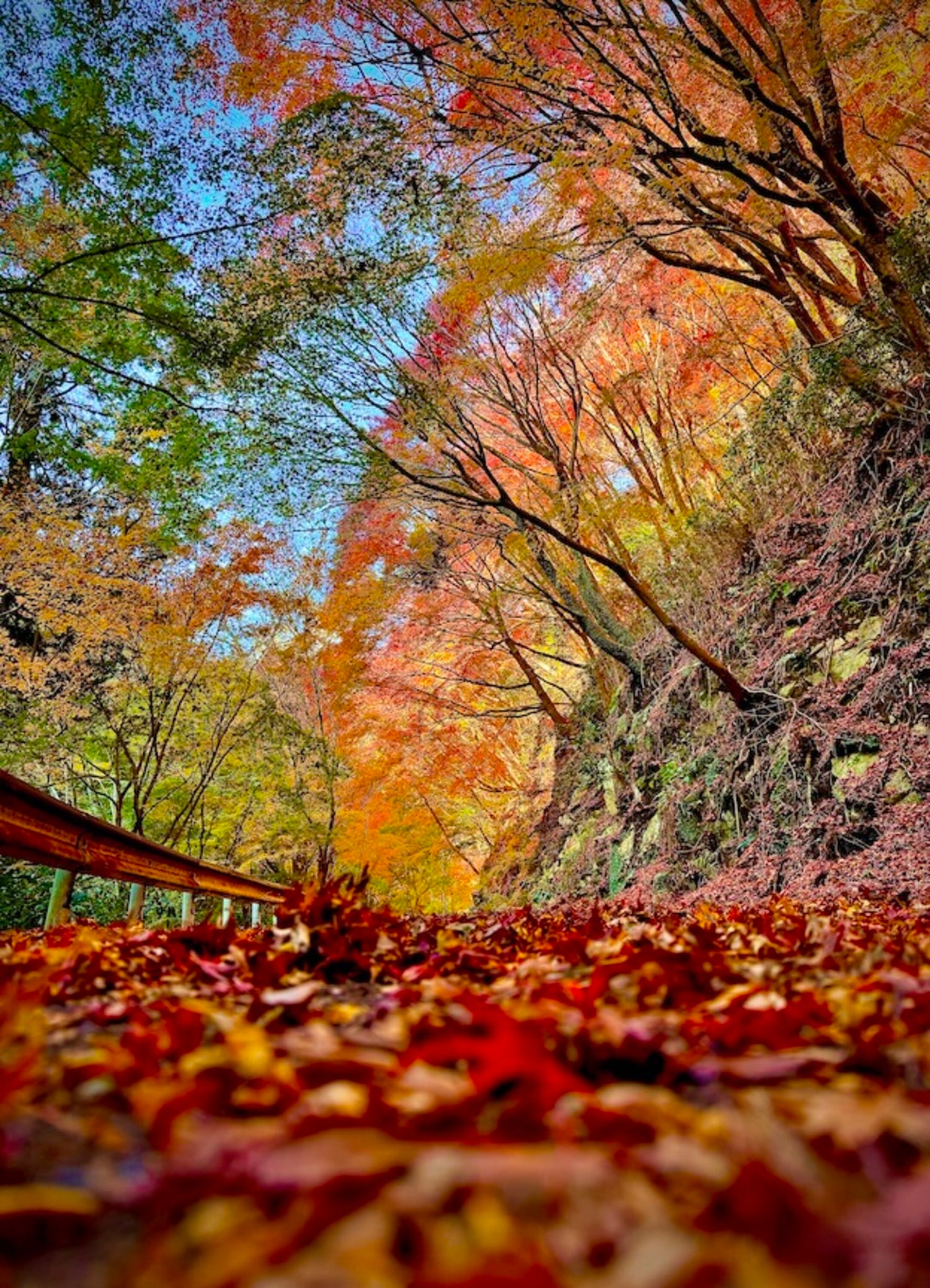 This photo was taken while walking along an abandoned road, and the contrast between the fallen leaves, autumn foliage, and blue sky is so beautiful.