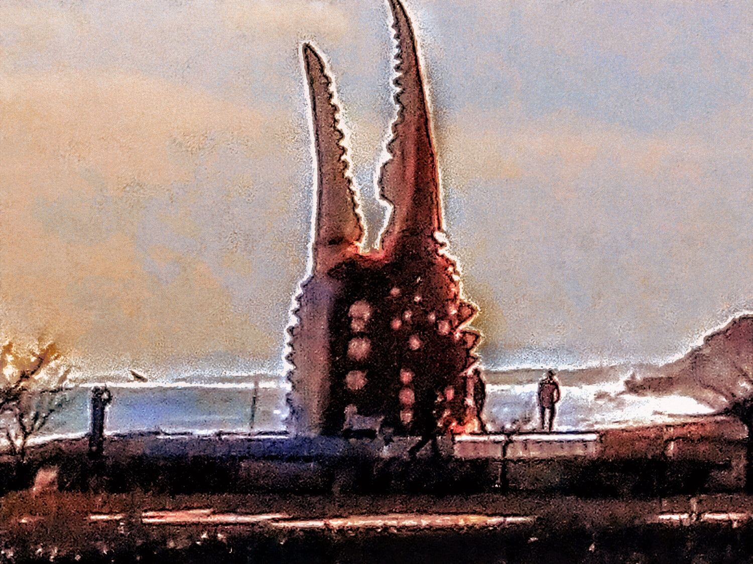 Eight years ago in the winter, I was on a two-day roadside station stamp rally in Hokkaido and Okhotsk, and while I was there I stopped off at the Okhotsk Monbetsu roadside station, where I took a photo of the crab claw sculpture as a memento of my trip. I made some adjustments to the brightness, hue, color temperature, and sky style.