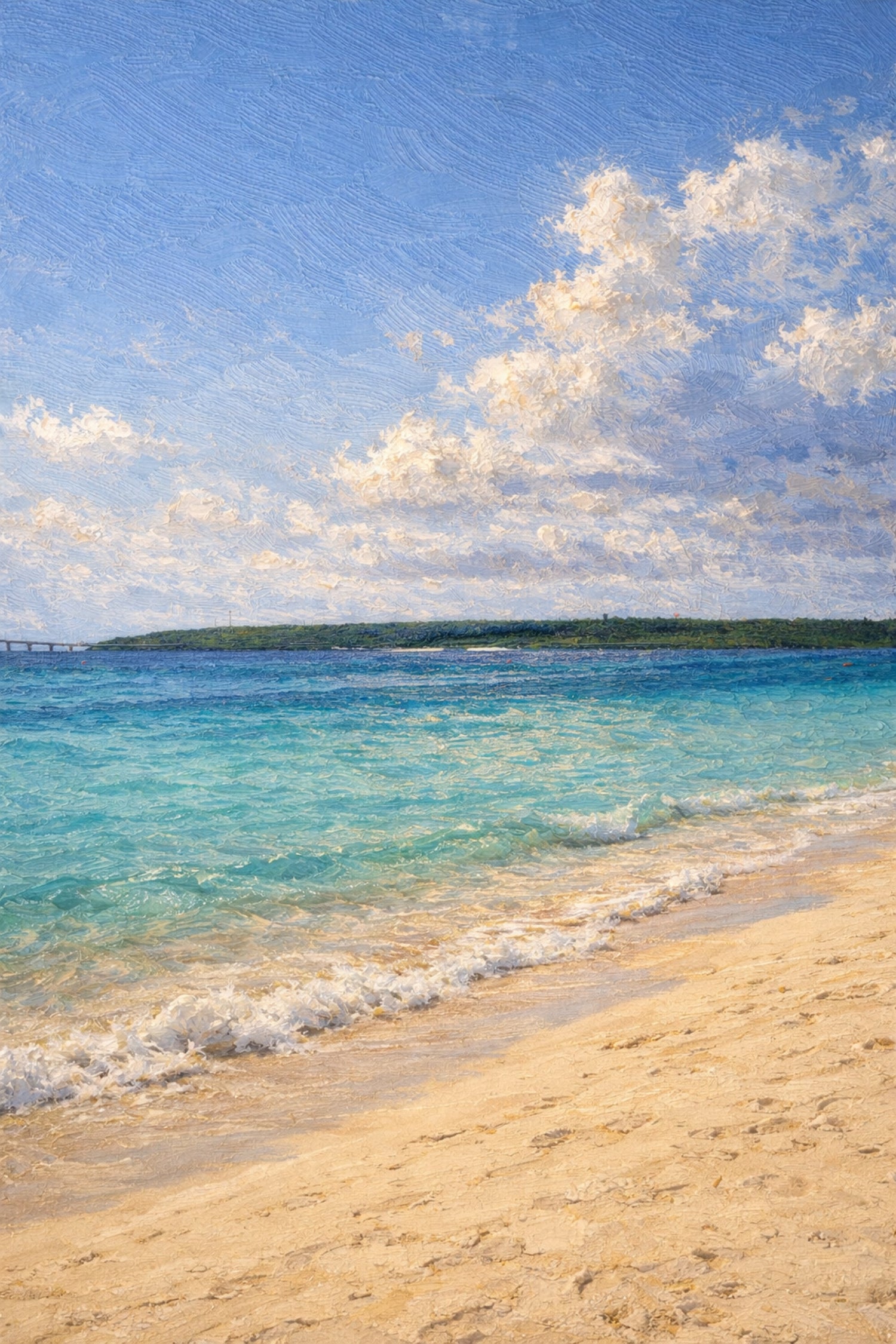 Gentle waves lapping against the sandy beach, the sea bathed in sunlight swaying gently.