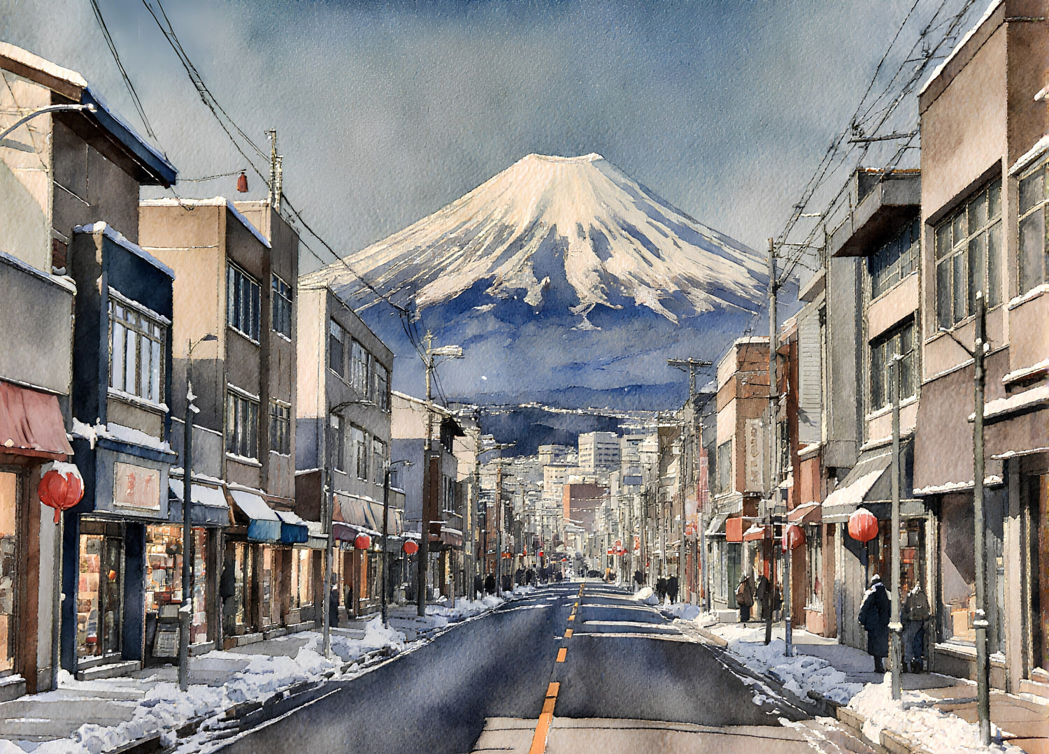 This is a view of Mount Fuji from a town on the Pacific side on a clear winter day.