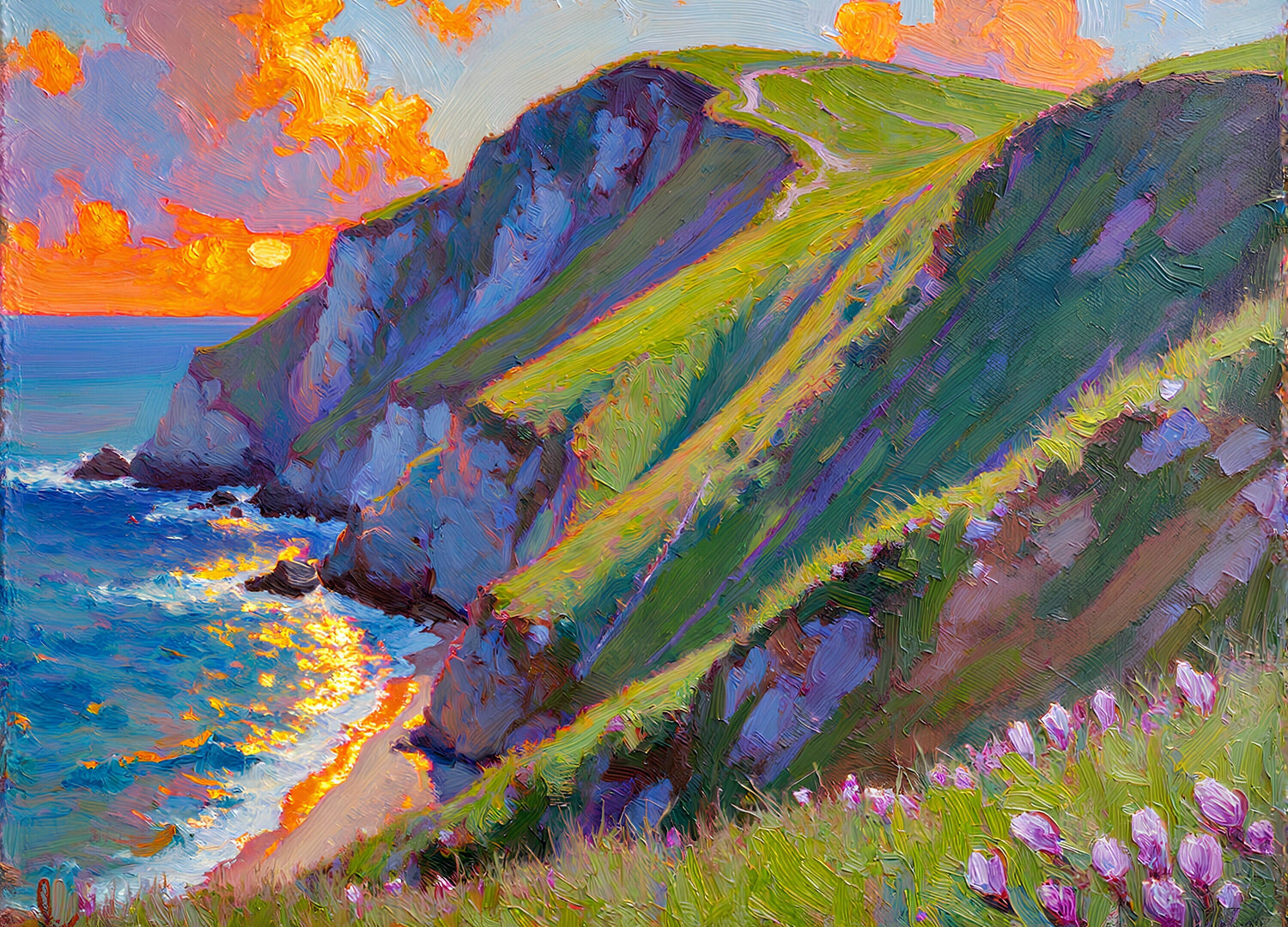 Spring coastal hills dyed in the sunset