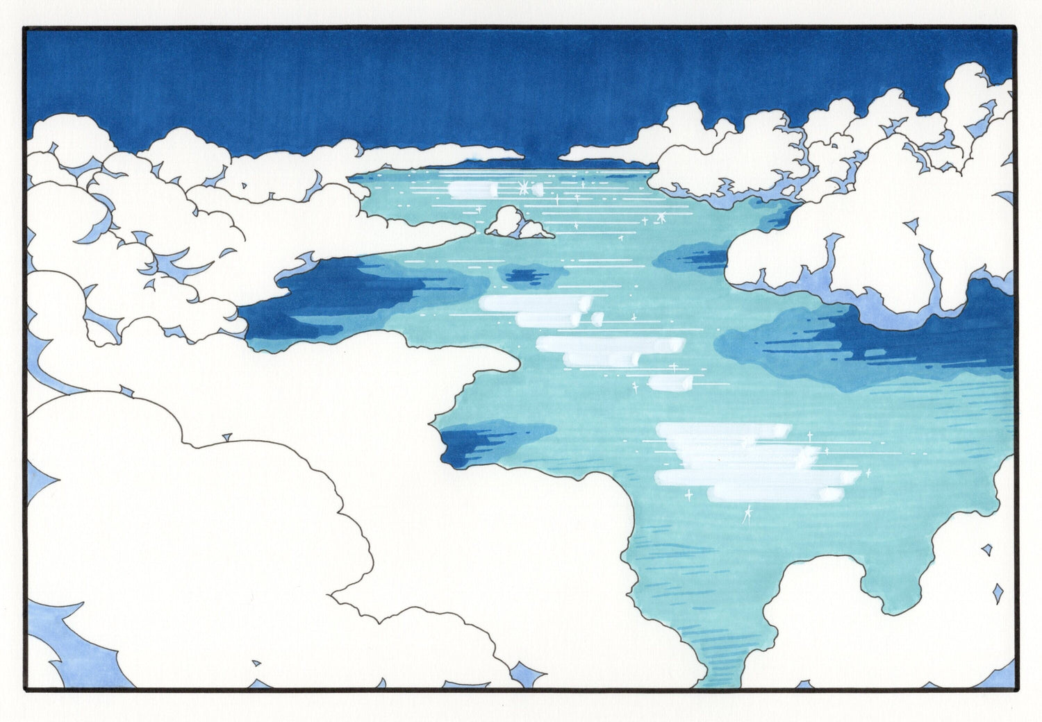なかなか見ることが難しい画角からの海と雲を描いた癒しの一枚です。