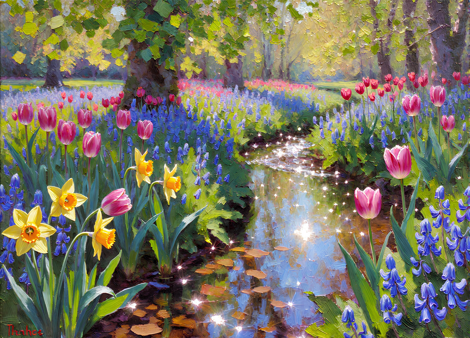チューリップ、ラッパスイセン、ブルーベルが満開です。