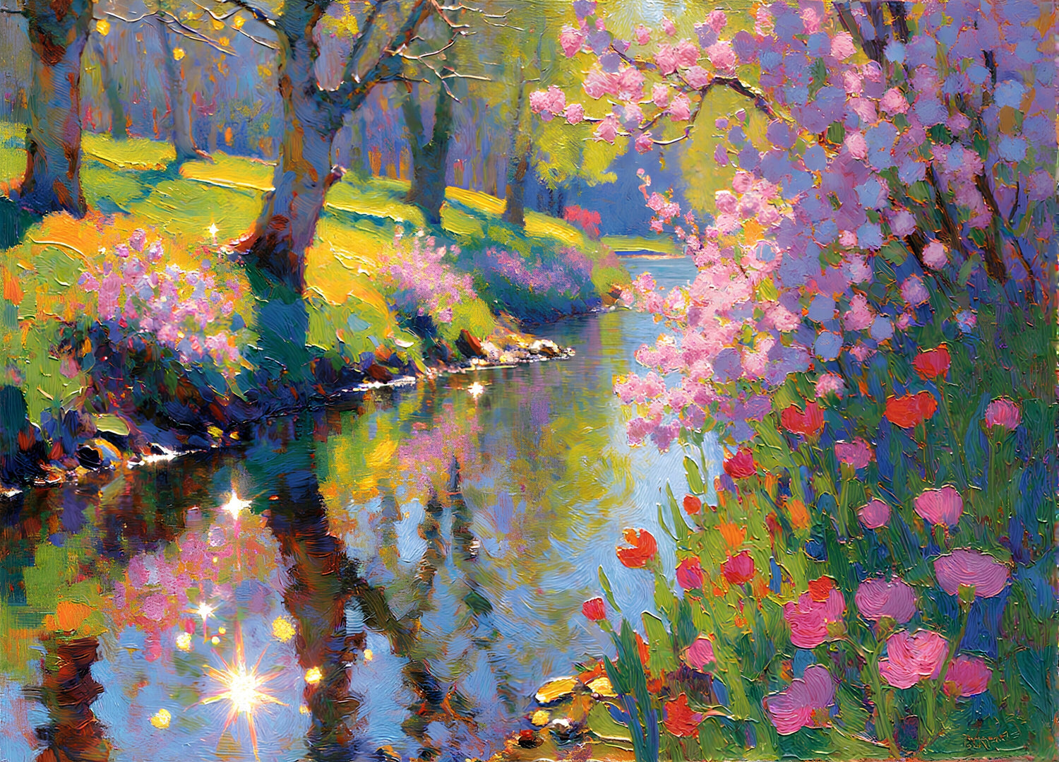 エネルギッシュで高揚感のある春の気分を描いた春の川岸