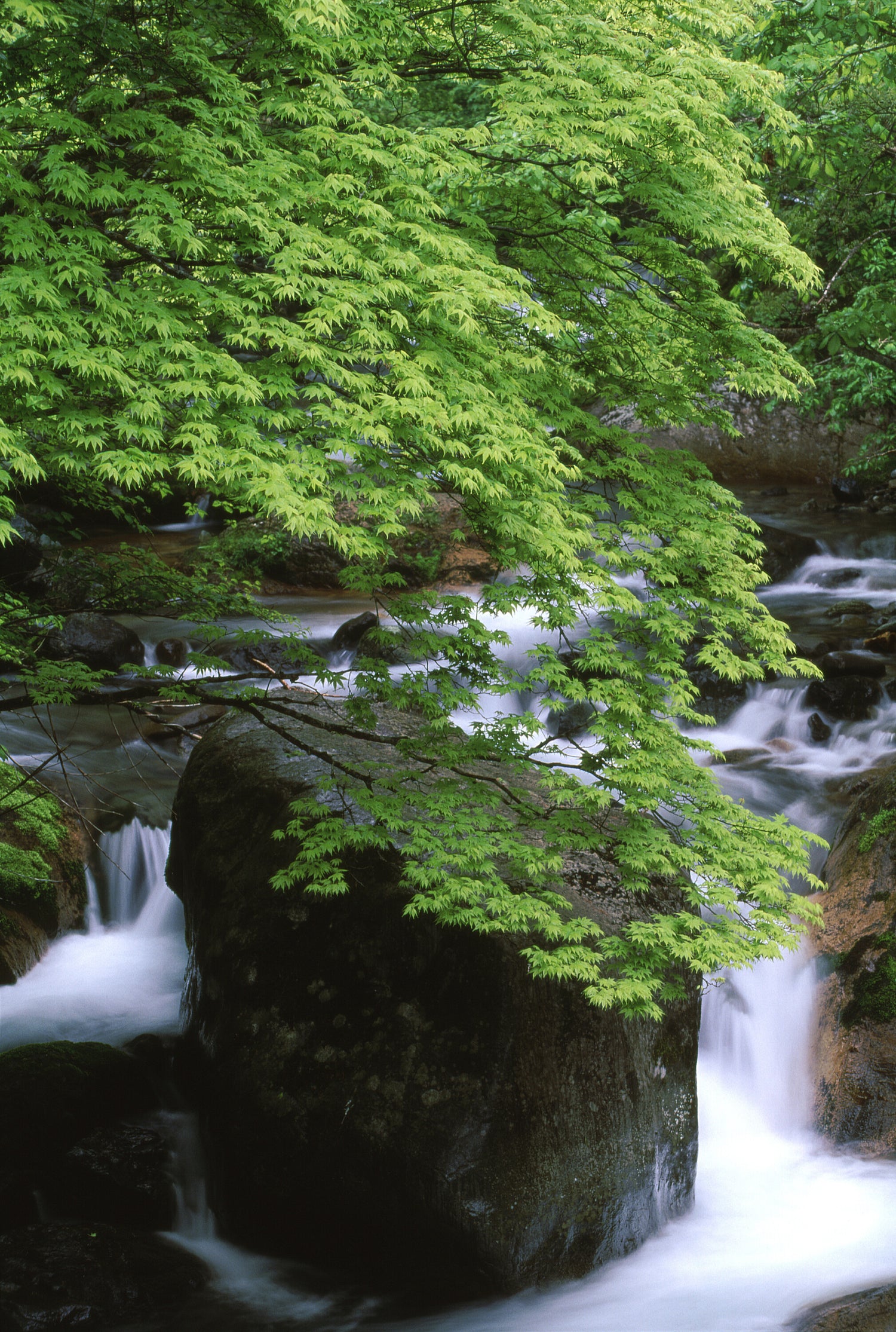 カエデの鮮やかな新緑と渓谷の水で、清涼感が感じられる組み合わせ。
