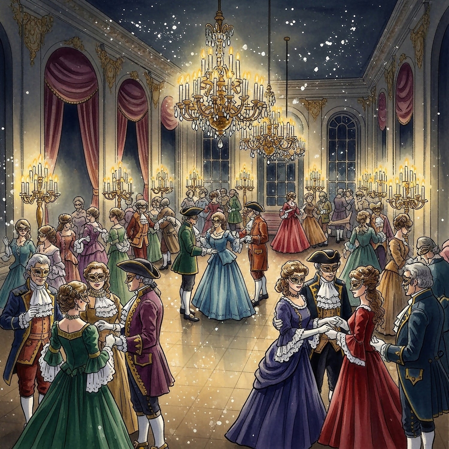 In the midst of the twinkling stars gently falling from the night sky, masked aristocrats are dancing an elegant waltz.