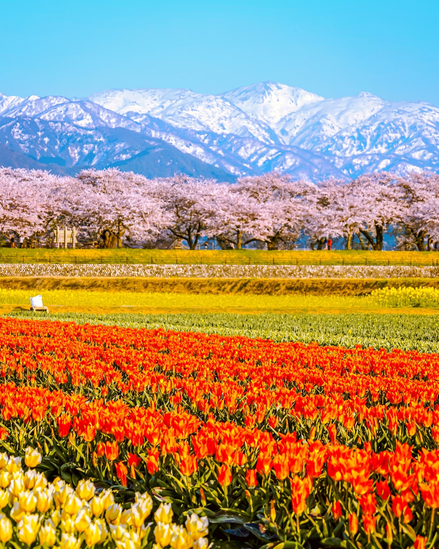 "Asahi Funagawa Spring Quartet" is a springtime tradition in Asahi Town where you can enjoy the beautiful quartet of cherry blossom trees, tulips, and rape blossoms along the Funagawa River against the backdrop of the beautiful snow-capped Northern Alps.