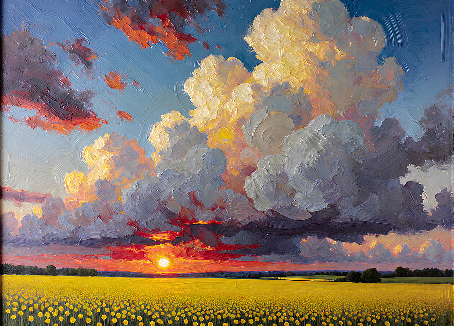 In the sky, huge clouds billow, capturing the light of the setting sun, and are painted with thick, sculptural brushstrokes.
