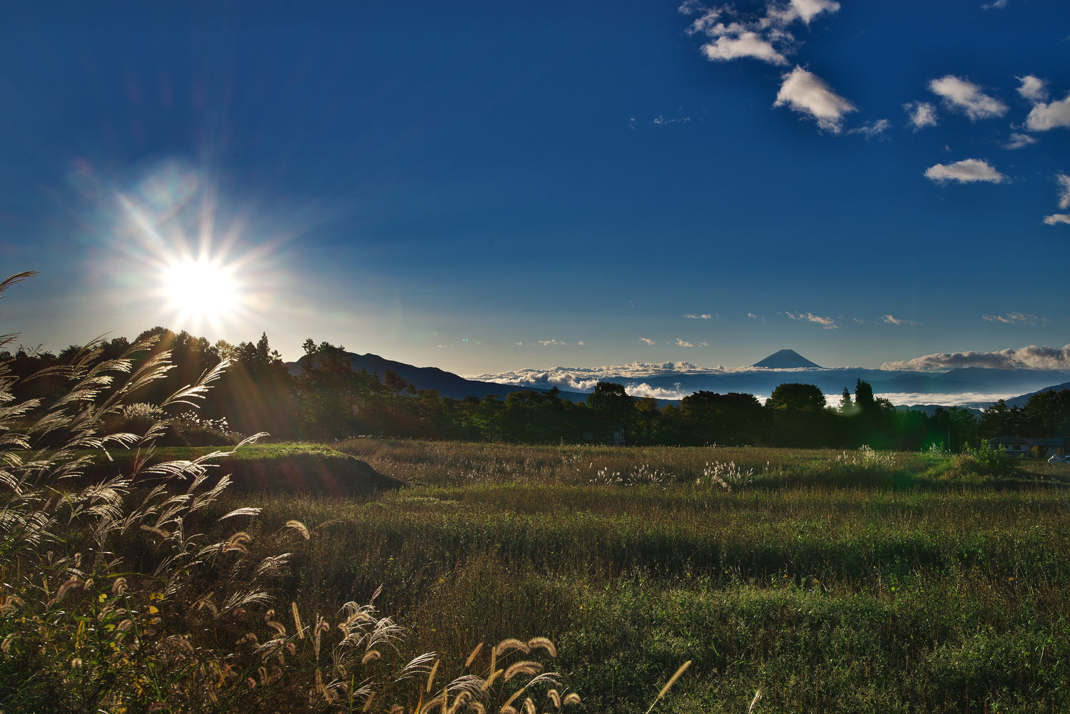 This morning scene, taken from Hokuto City, Yamanashi Prefecture, features Mount Fuji gracefully emerging from a sea of clouds and an impressive grassland illuminated by the morning sun.