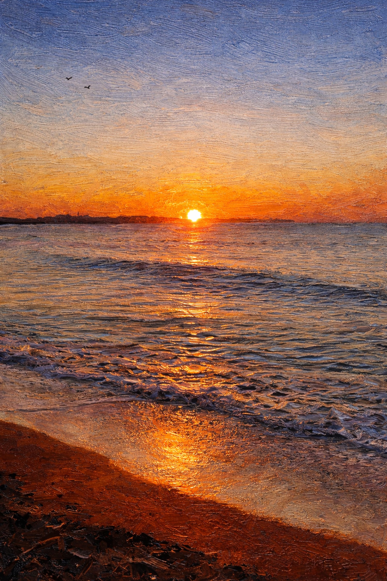 The time when the sun is setting is enveloped in the quiet sound of the waves.