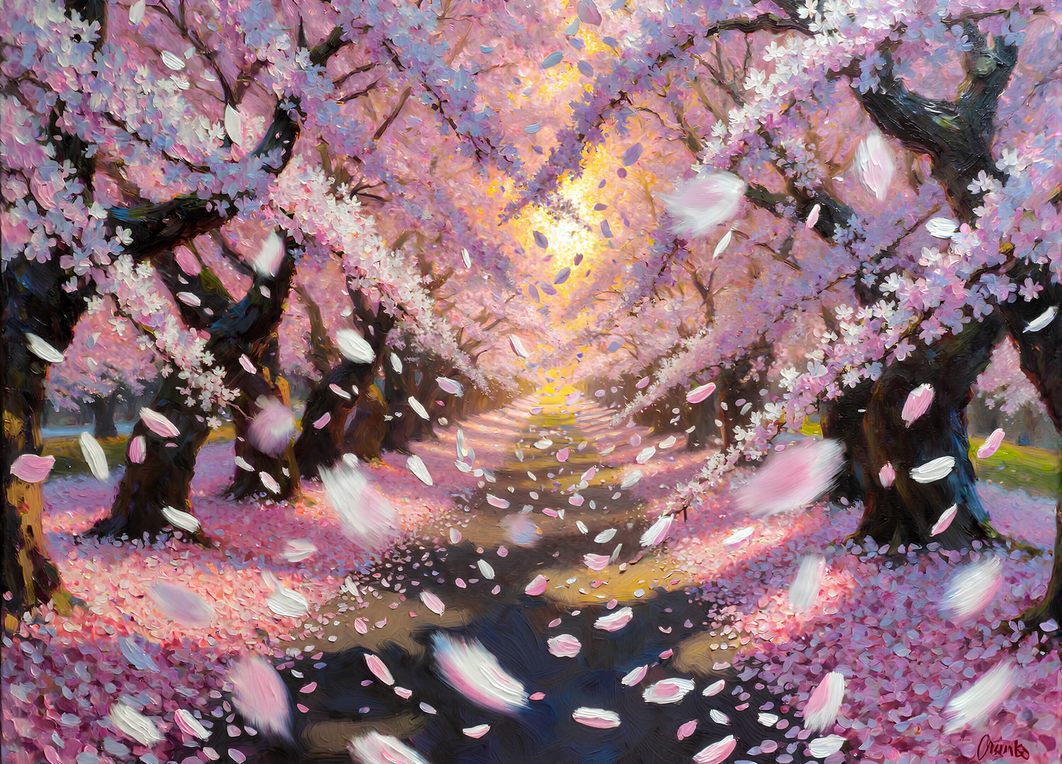 何百万枚もの花びらに、厚塗りされた絵の具の質感が、舞い散る花吹雪のように空気を満たします。