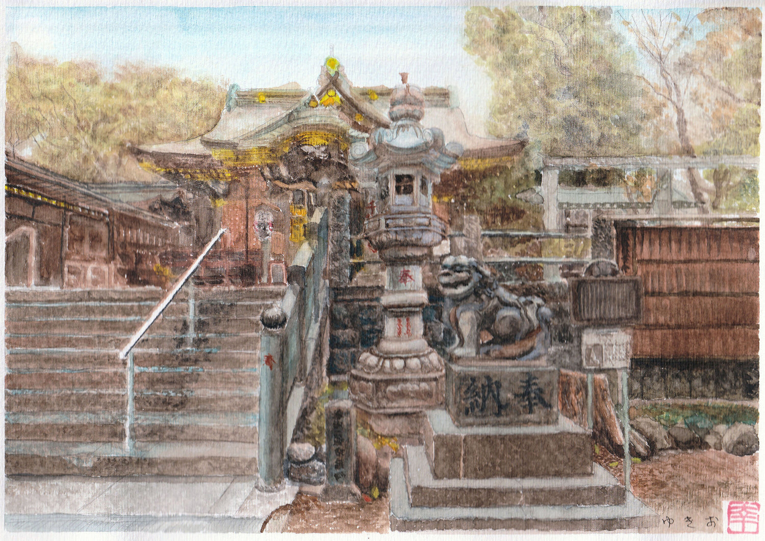 Watercolor painting of Owashi Shrine in Hanabatake, Adachi Ward. Komainu guarding the shrine.
