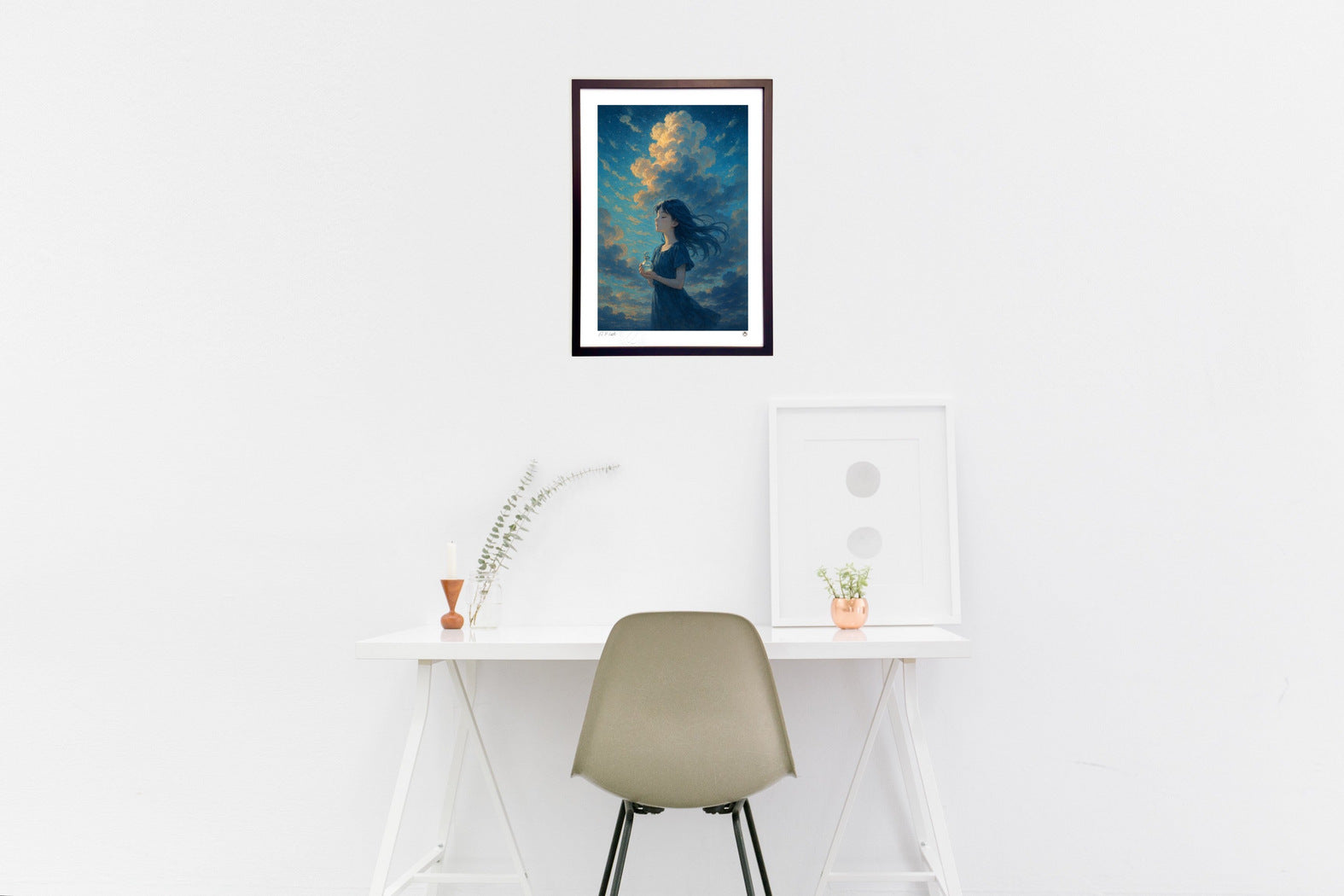 The frame color will be the same as the artwork image. You can change it if you wish. You can choose from white, natural, brown, or black. If you have a preference, please write "XX frame desired" in the comments section when placing your order.