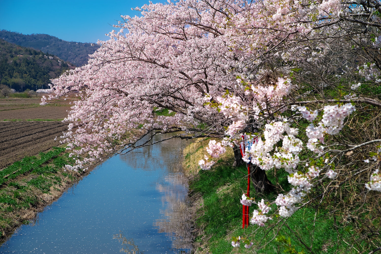 This photo captures a spectacular spring scene that can be encountered on the Suigo Meguri tour of Omihachiman City, Shiga Prefecture. With the rural landscape and riverside in the background, the cherry blossoms in full bloom are gently reflected on the river's surface, creating a scene of tranquility and beauty reminiscent of a picture scroll. The sight of the cherry blossoms blending into nature is a memorable example of the original Japanese landscape.