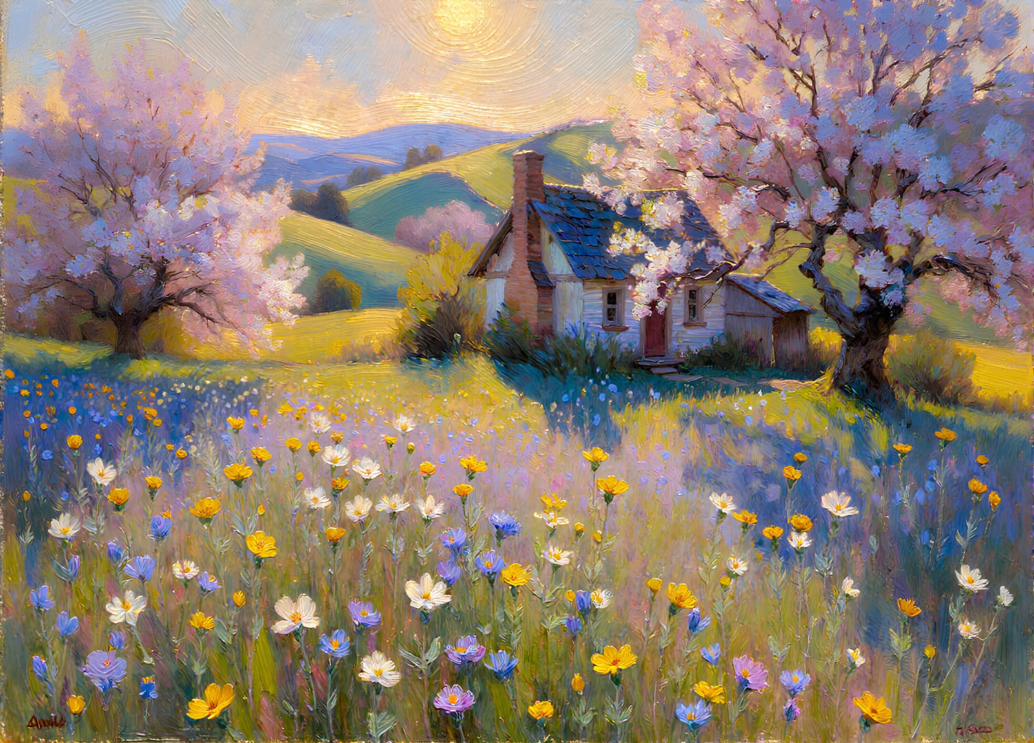 A small, rustic cottage surrounded by cherry trees