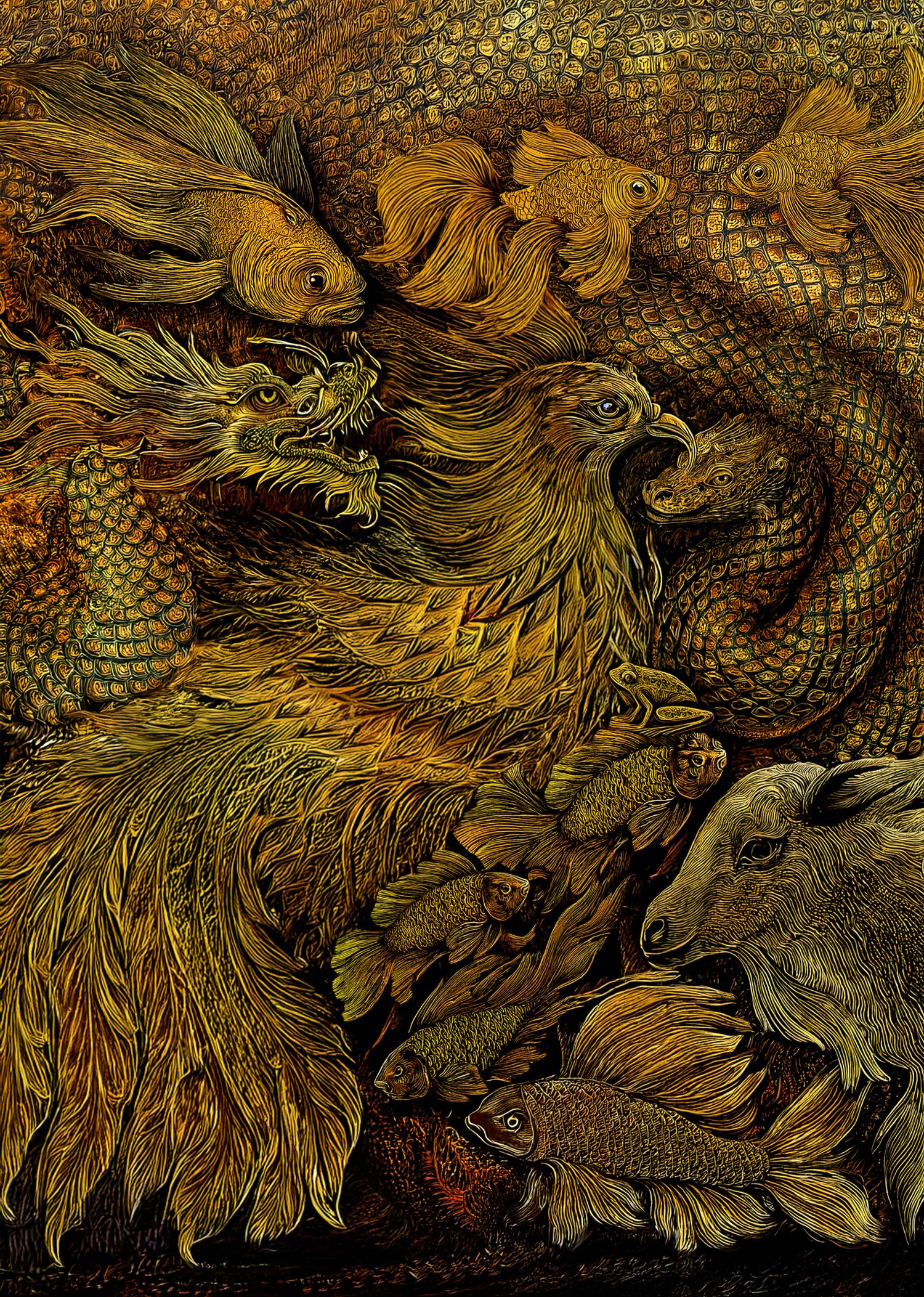 This is an auspicious painting of a phoenix, a golden dragon, and a goldfish.
