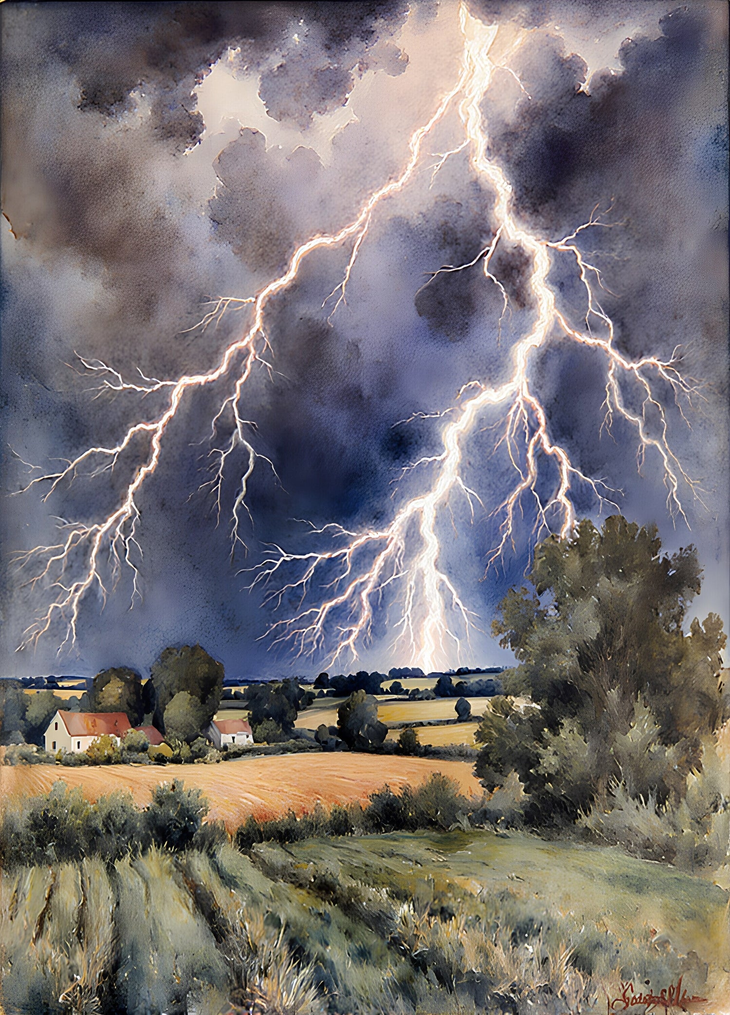 田園地帯に嵐が来て空が暗くなり、大きなかみなりが落ちました。