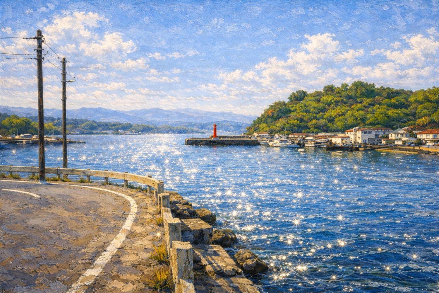 きらめく海へ続く港町のカーブ
