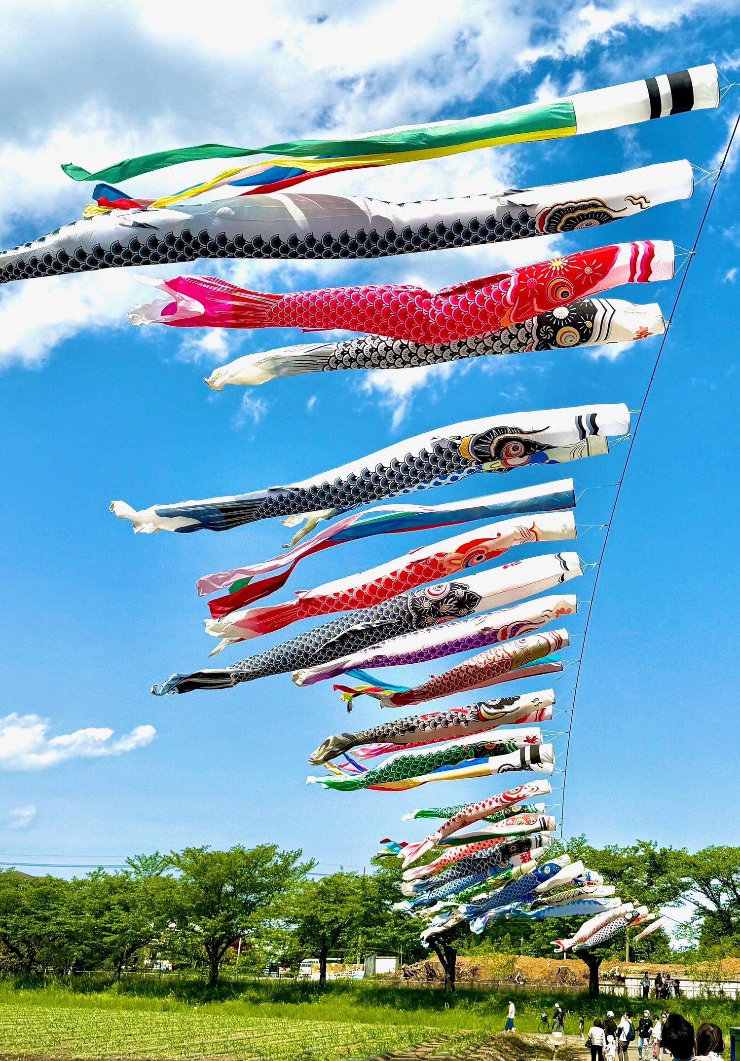 あおいそらには、いろとりどりのこいのぼりが、げんきにおよいでいる。赤、青、緑、むらさき……ひとつひとつのこいのぼりが、春風をうけてゆったりとゆれている。そのすがたはとてもカラフルで、まるでそらに絵をかいたよう。