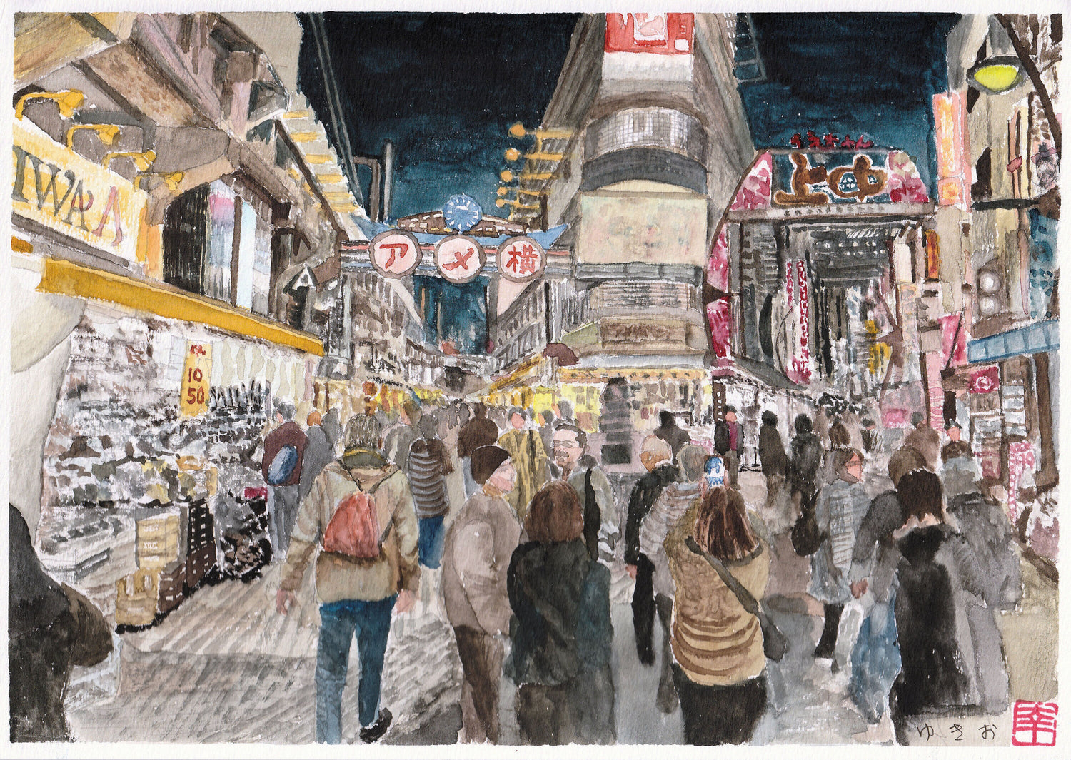 水彩画 アメ横と上中に分かれる手前 これから忘年会に向かう途中