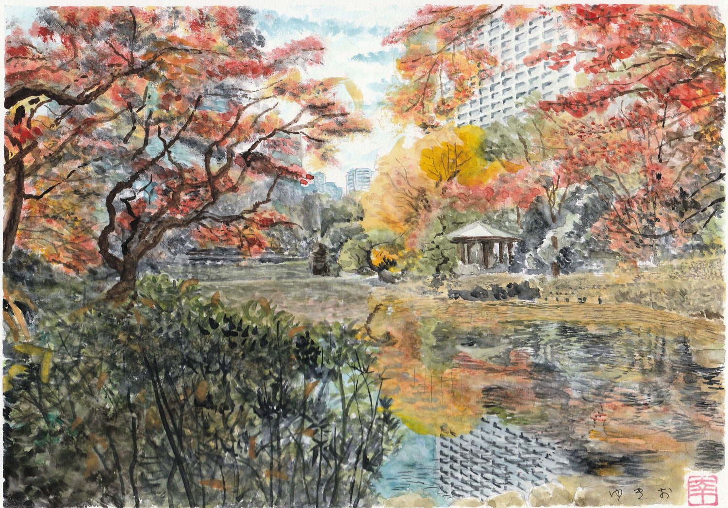 水彩画 日比谷公園 東屋が佇んでいる様子