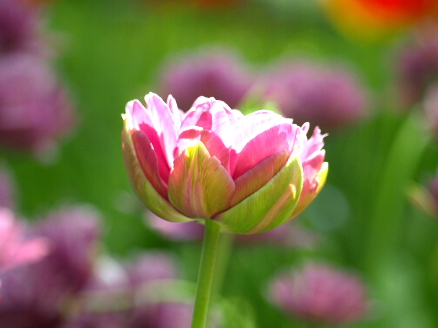 紫の花の中に、1輪だけ、ピンクと白の美しい花が、ひかりにむかって、すっと立っていました