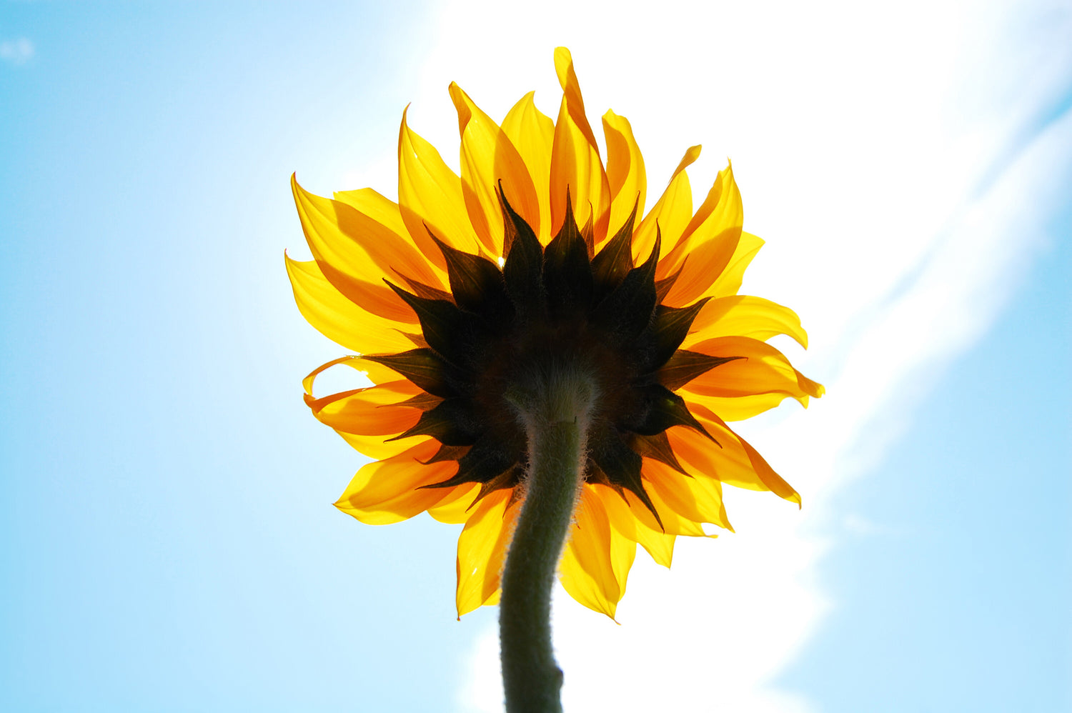 夏の光を浴びて青空に向かって燦々と咲くひまわり
