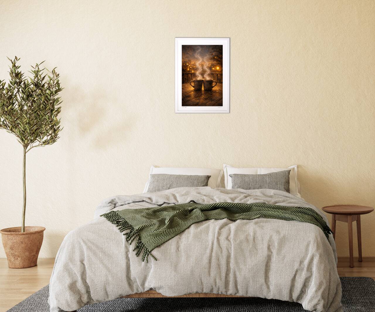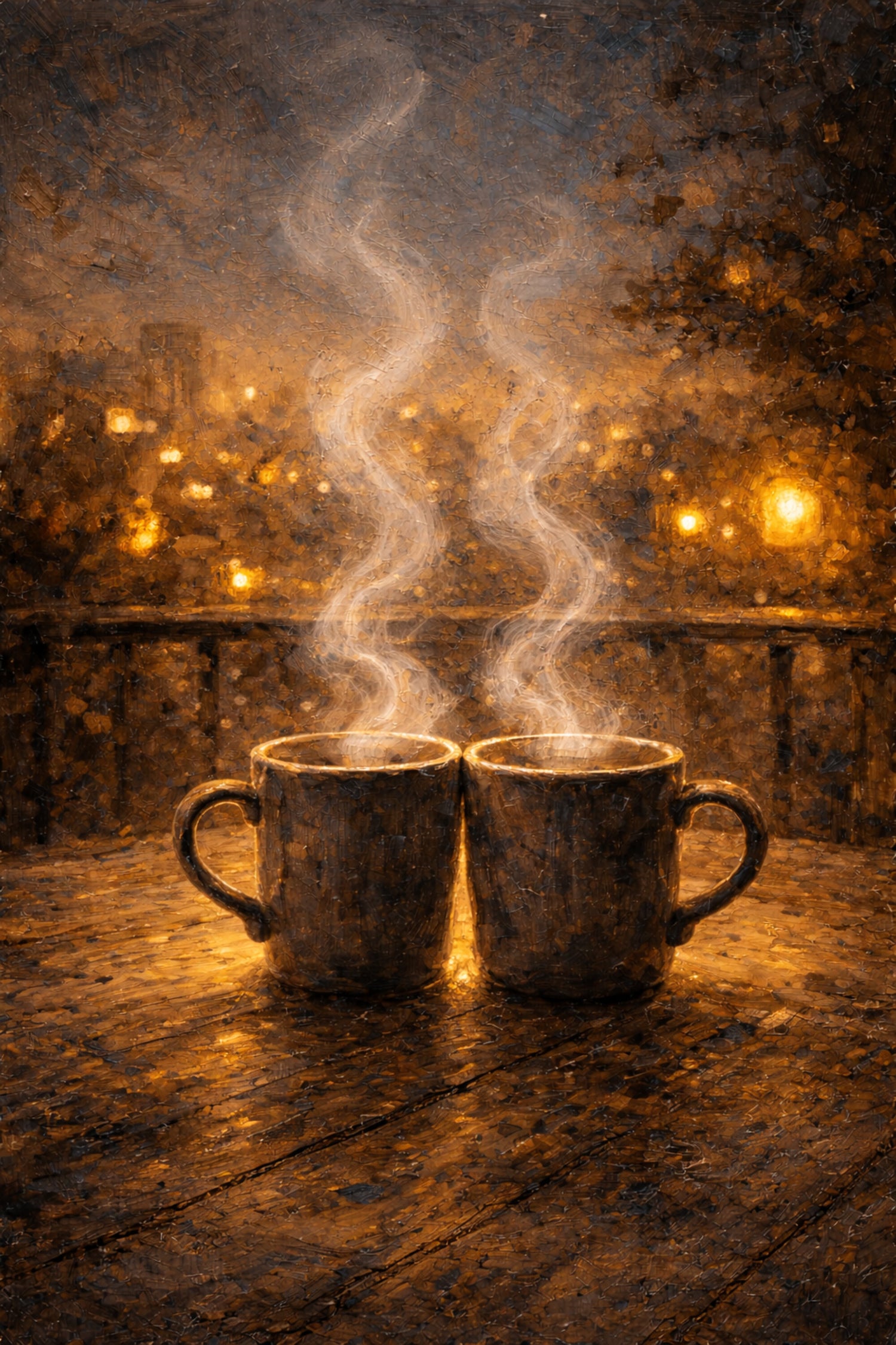 静かな夜の灯りの中、二つのコーヒーカップから立ち上る湯気が印象的な作品です。