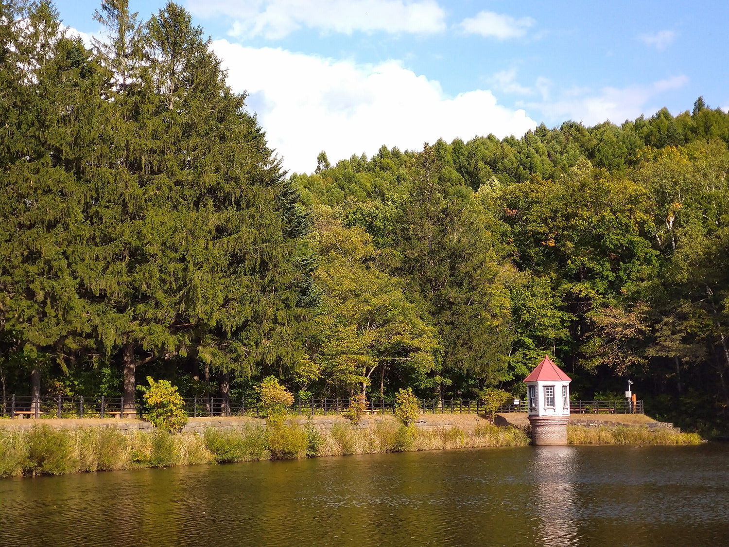秋景色になり始めの西岡水源池に映えるワンポイントの取水塔がアクセントになり、まるでムーミンの風景を思わせる撮影スポット。
