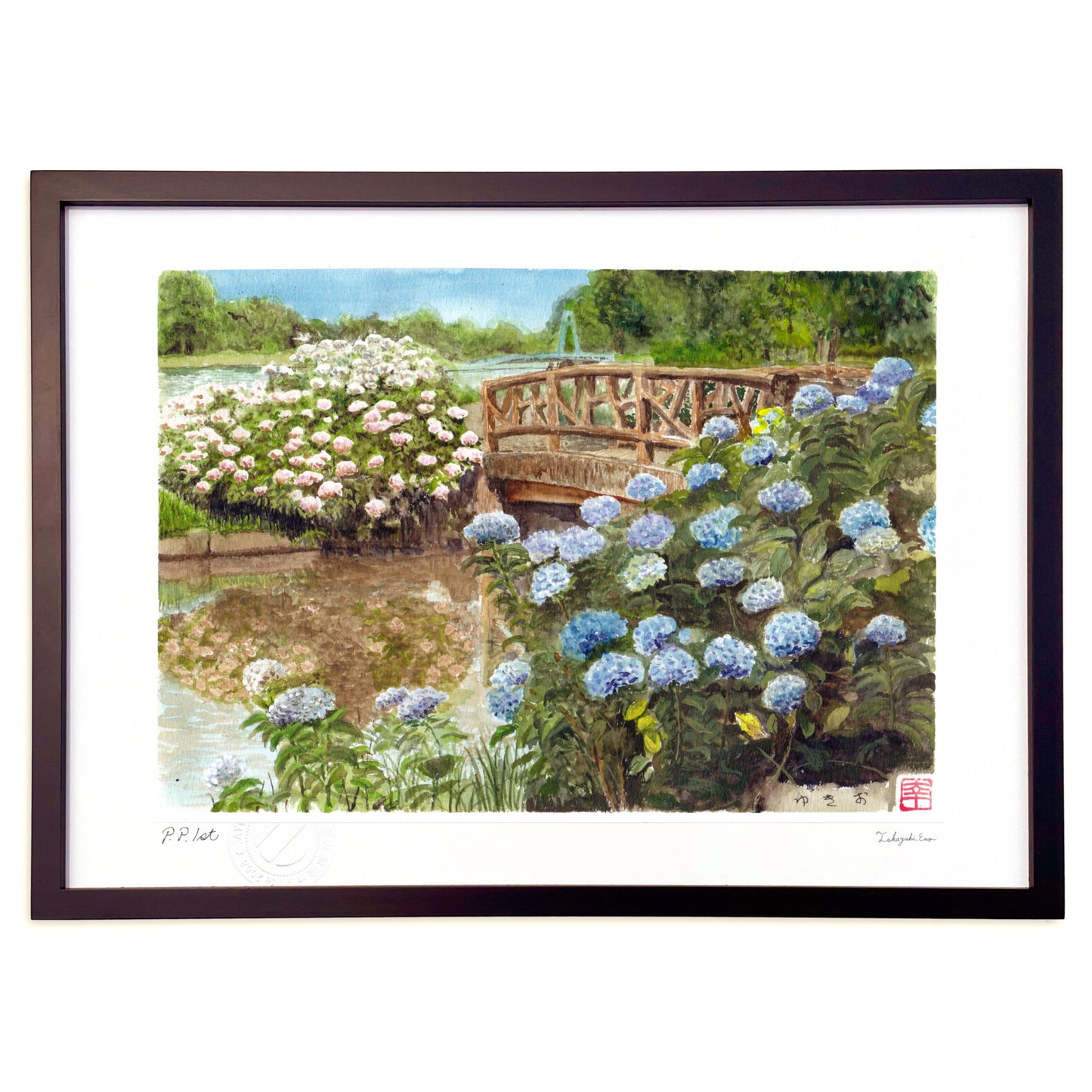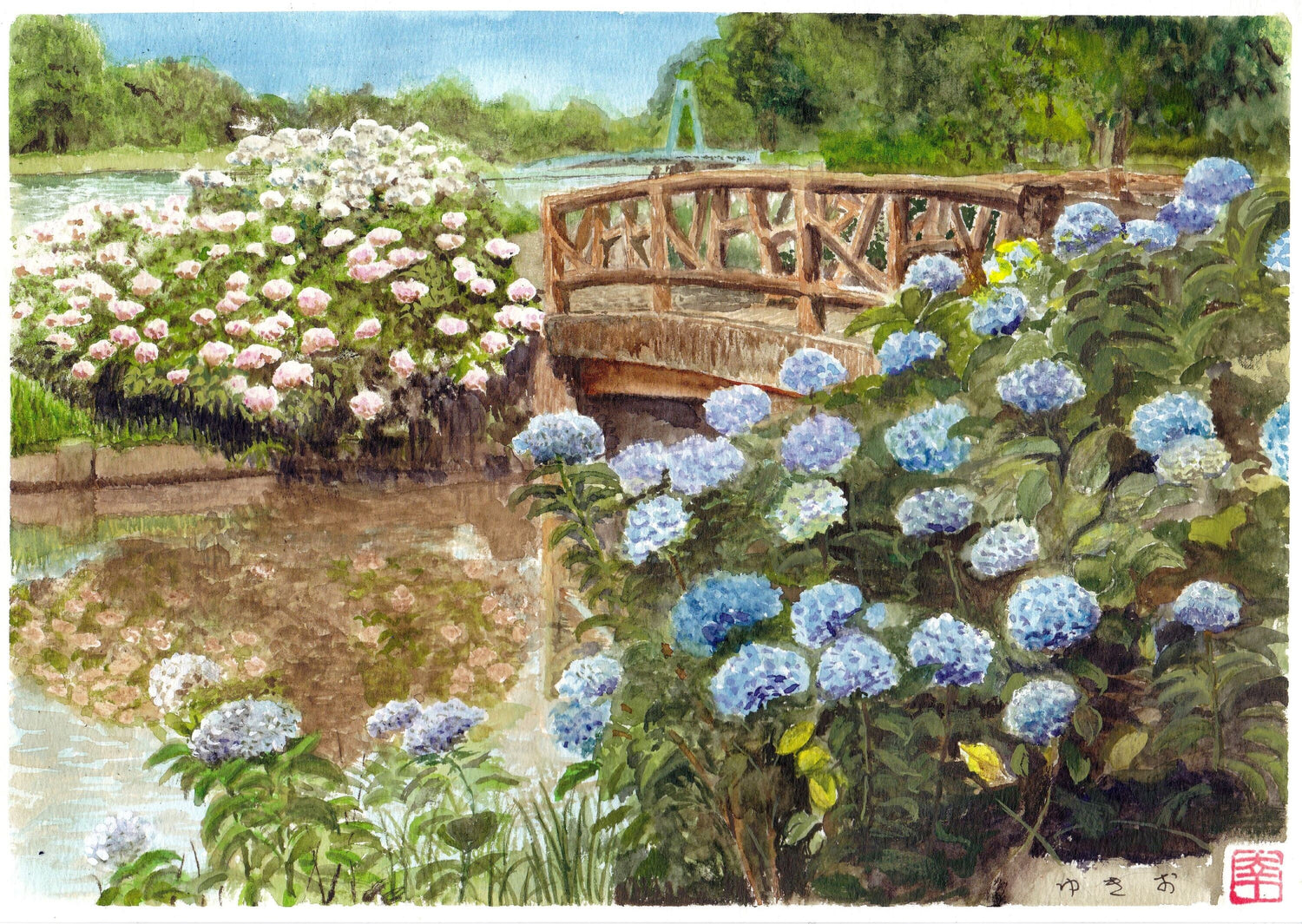 水彩画 みさと公園の紫陽花 遠くの真ん中に見えるのは水元大橋です。