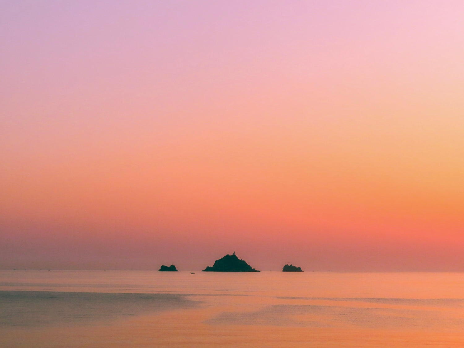 ある春の朝。朝霞がたなびく中、夜明けの海に広がる淡いピンクの光、優しい色のグラデーション。波も風も静まり返った中で、新しい一日の始まりを告げているようです。