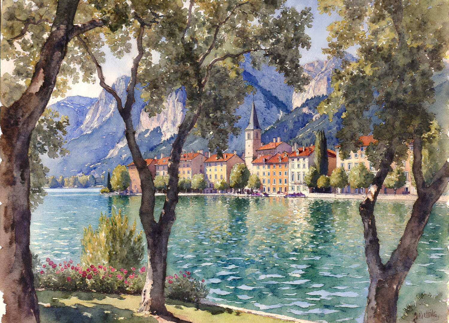 アルプスの山々に囲まれたエメラルドブルーの水面と、静かな公園の木々が、心に溜まったものを洗い流してくれるような清潔感を与えます。