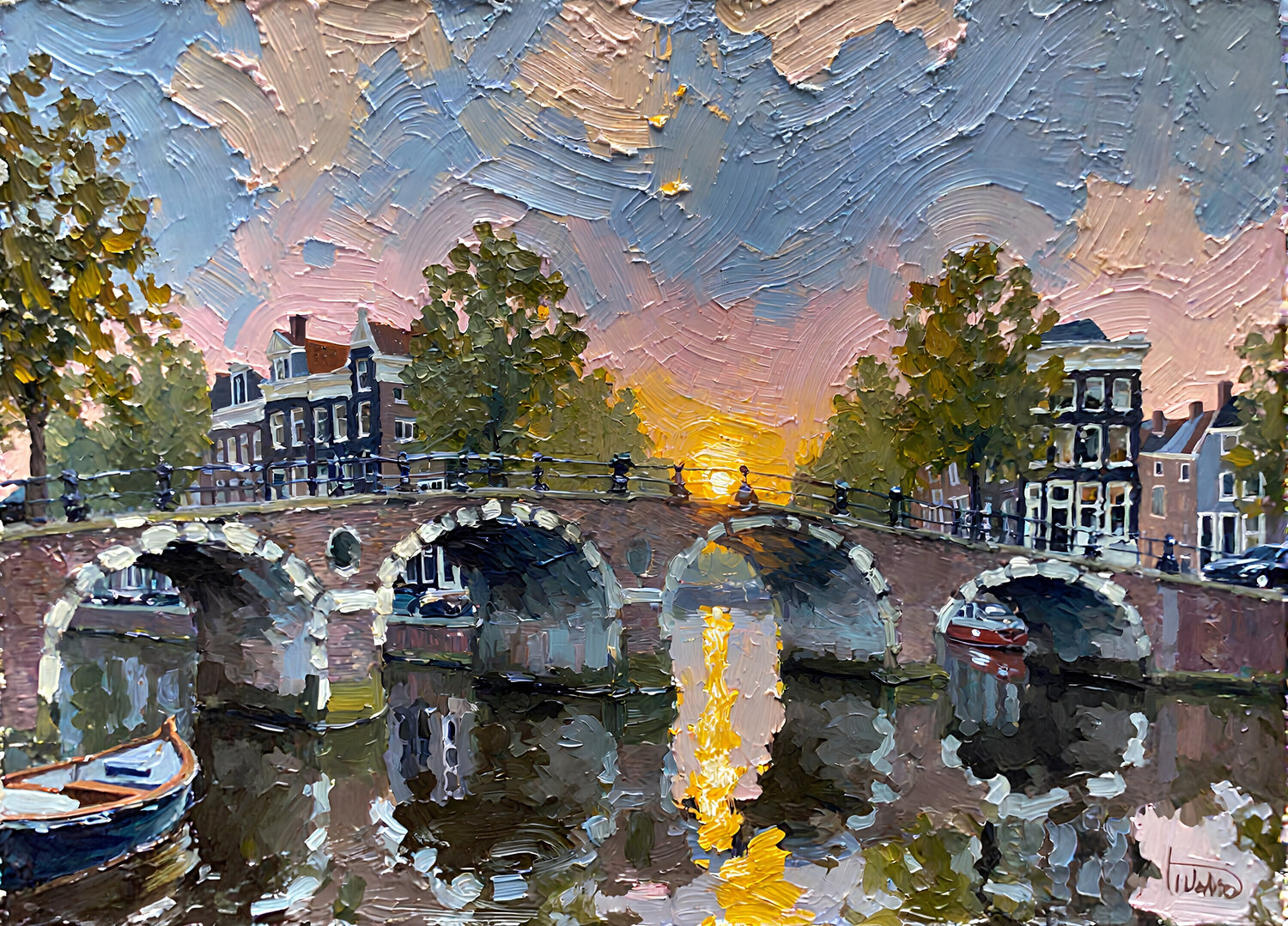 橋や建物の反射はぼやけ、空は深い青から淡いピンクへと移り変わっていきます。