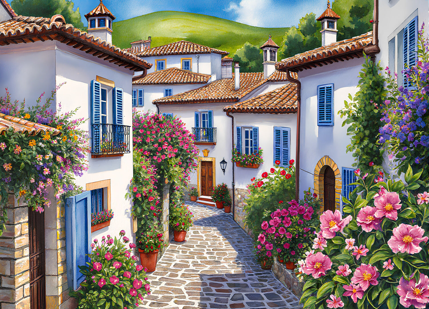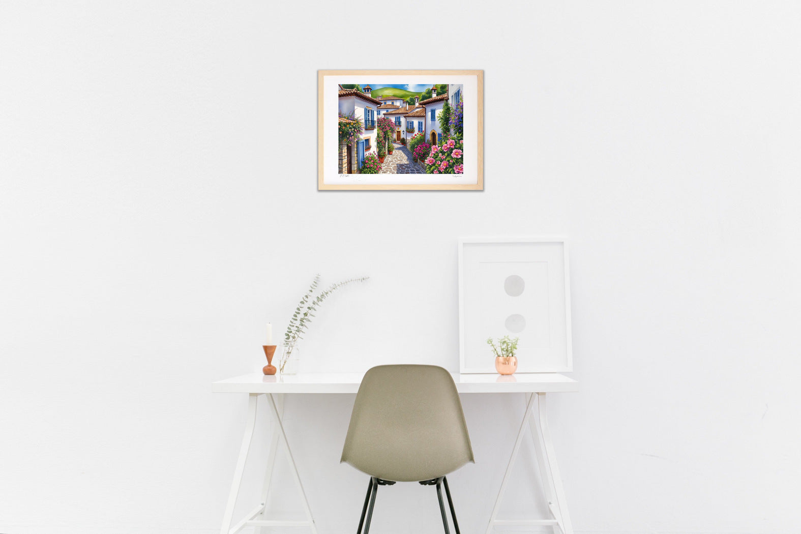 青い空、明るい夏の光が輝く村。色とりどりの花が咲いている。