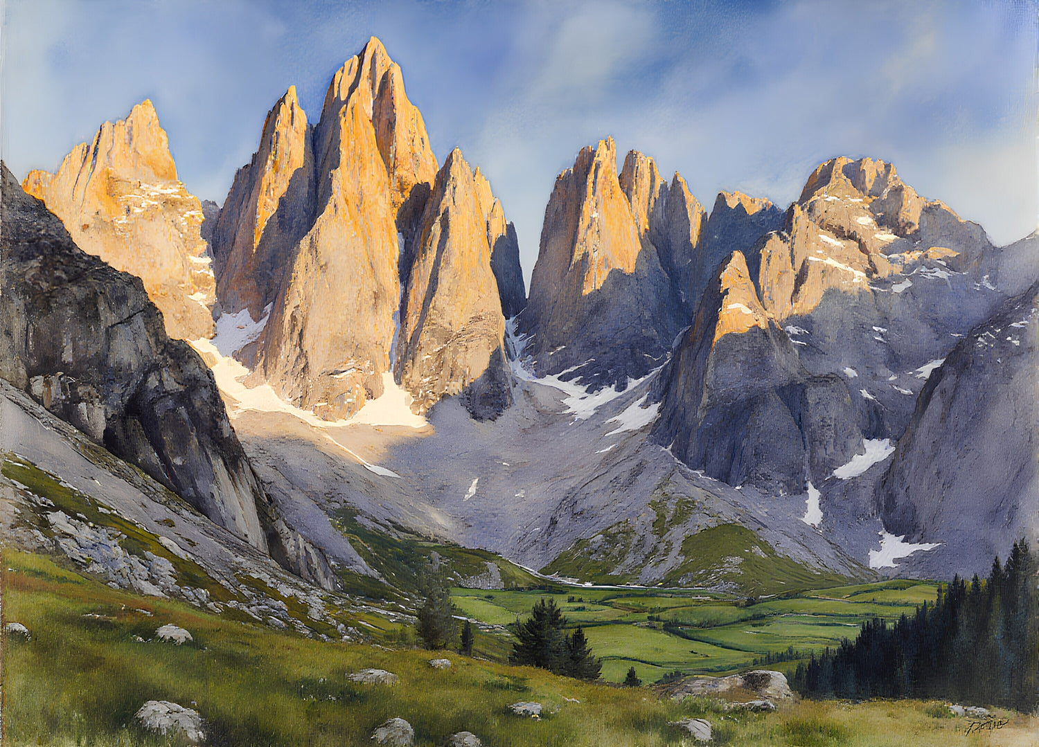 切り立った灰色の石灰岩の山々が、緑の谷と青い空に映え、夕日が山にあたっています。