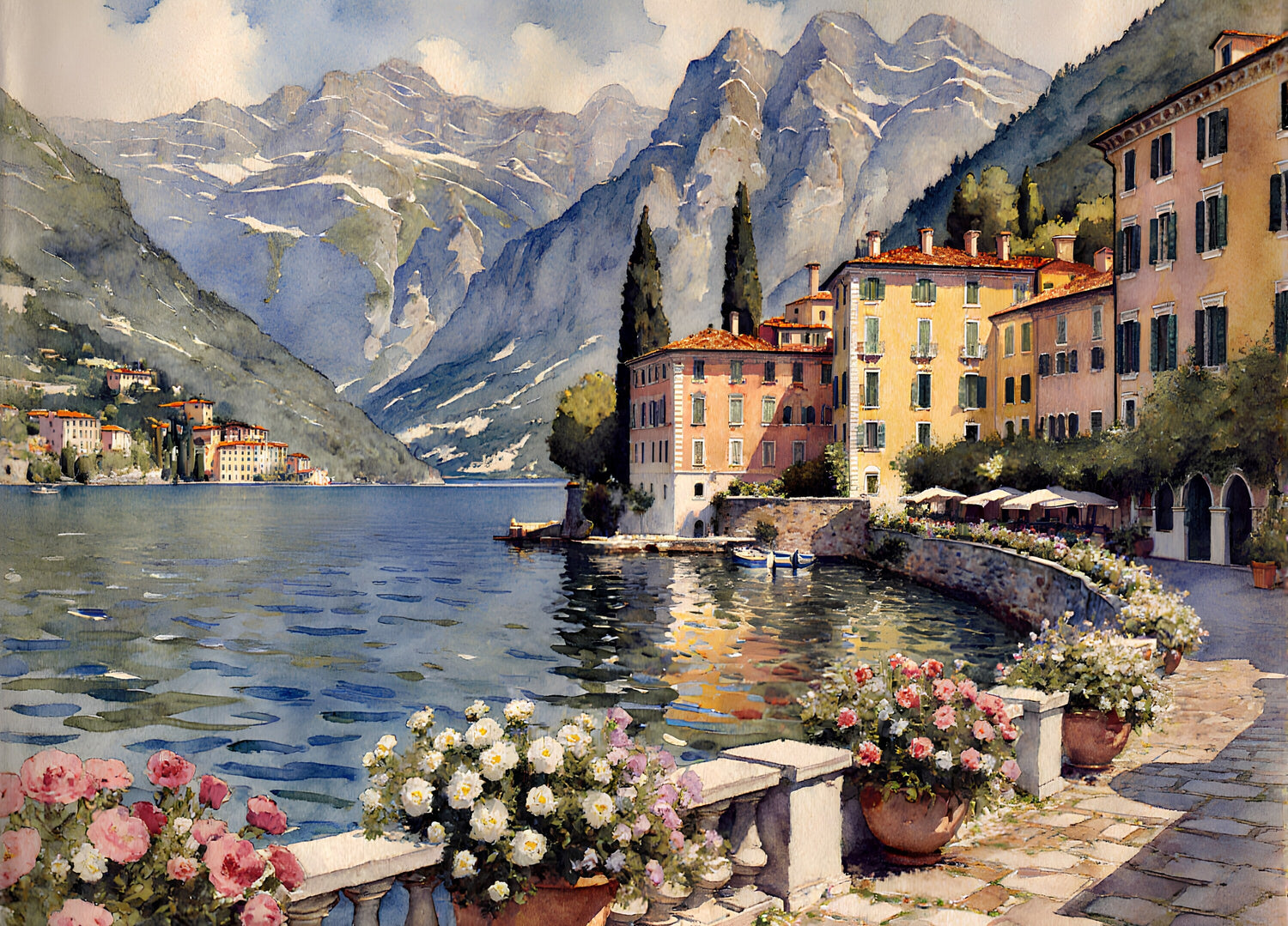 優雅な別荘、湖畔を飾る溢れんばかりの花々、山々を背景にした穏やかな湖