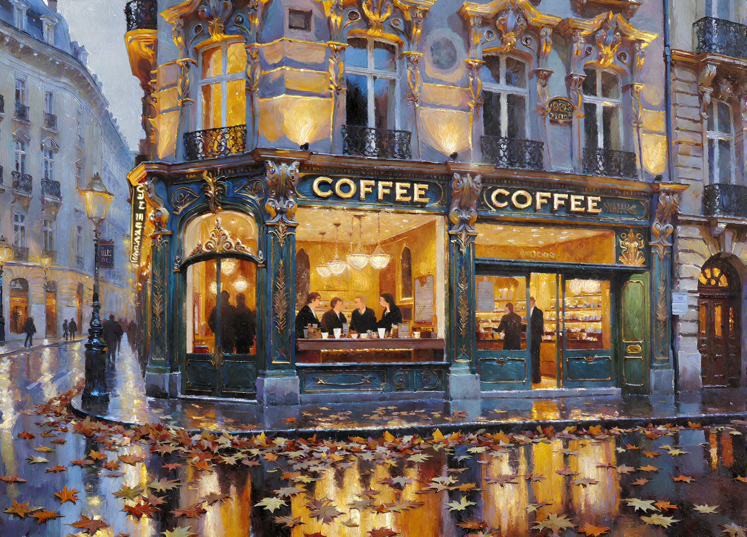 秋のウィーンのコーヒーハウスの外観を描いた絵画