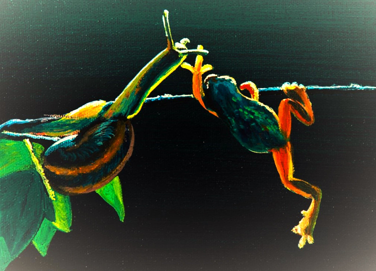 カエルとカタツムリ・・・お互いに頑固だ、道は譲らない・・・壮絶な戦いだ。