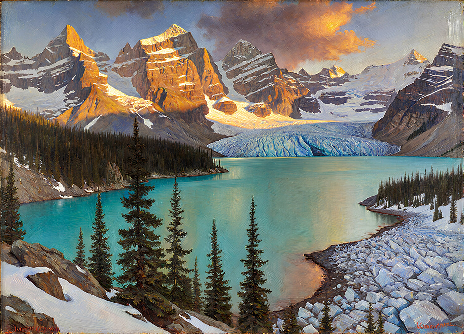鮮やかな青緑色の湖水と雪を抱いた山々の風景
