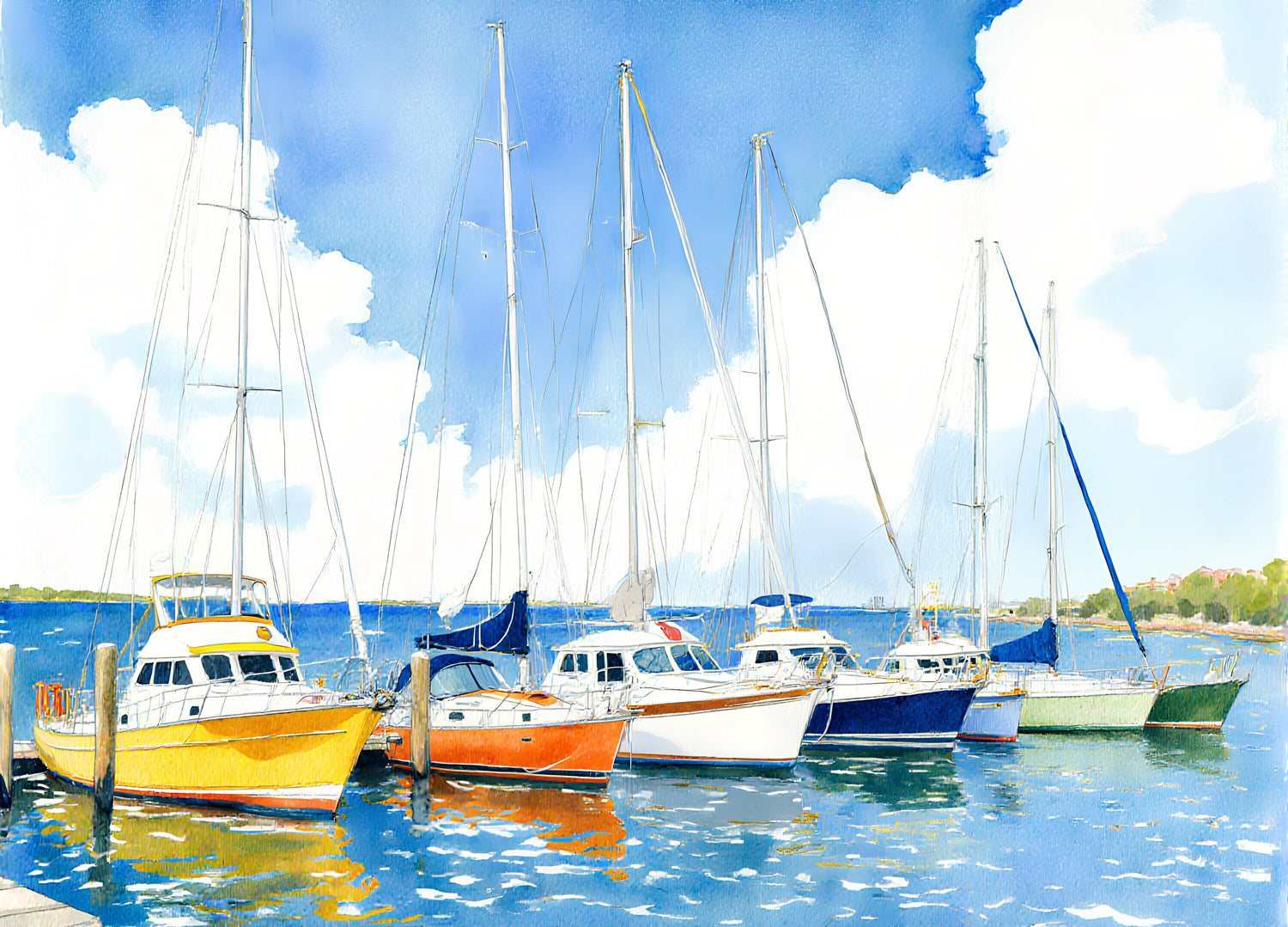黄色、オレンジ、青、緑、白のヨットが停泊しています。