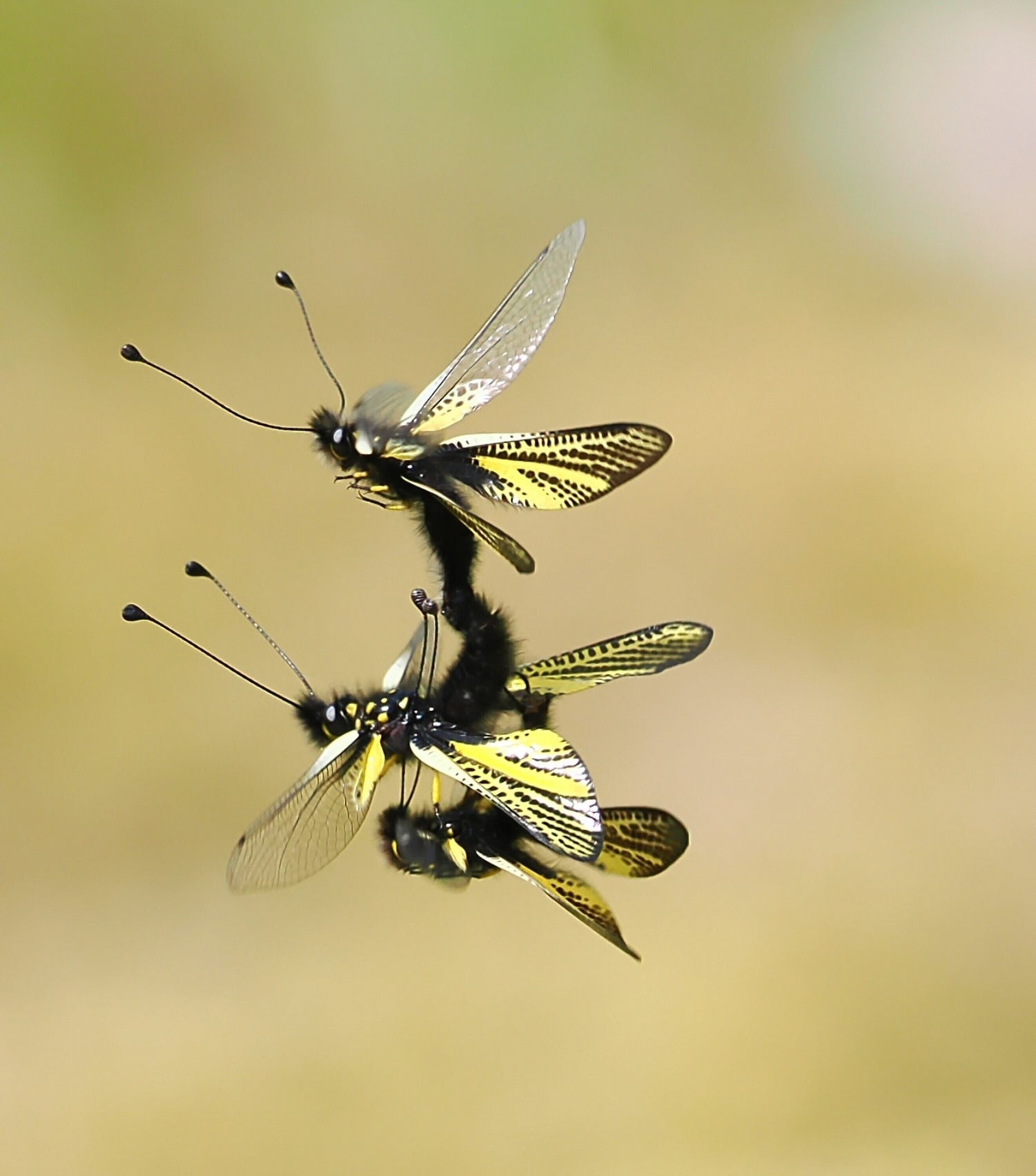 キバネツノトンボの交尾飛翔写真です、おじゃま虫乱入