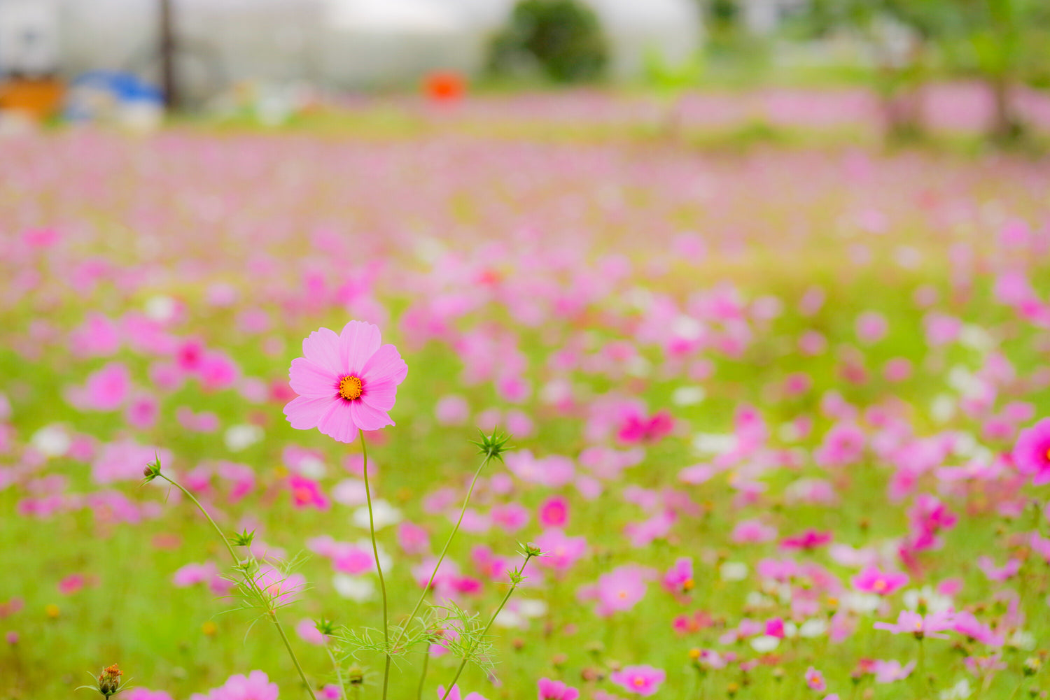 沖縄では、春先にコスモスの畑を見る事が出来ます
