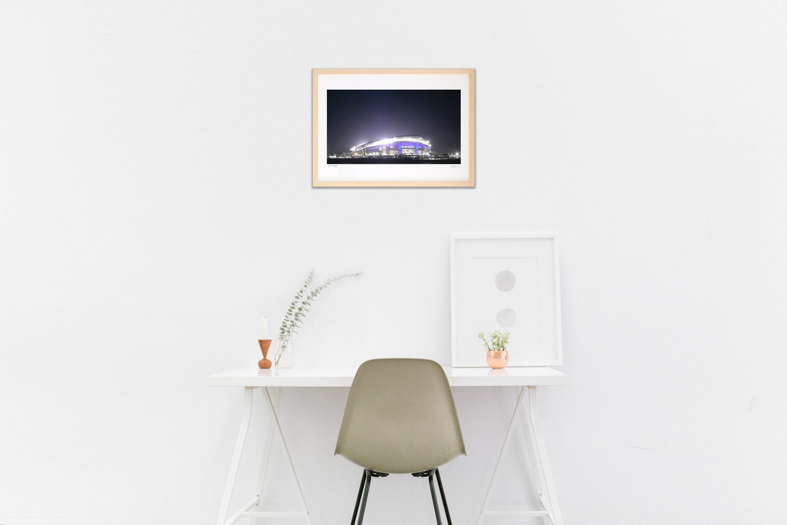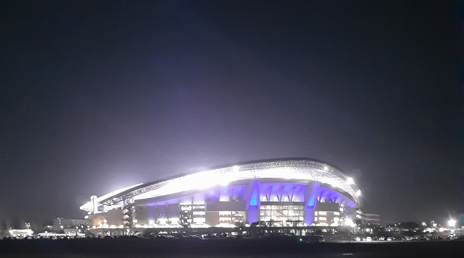 試合後のスタジアムのライトアップ。キレイなので写真撮ってしまいました。
