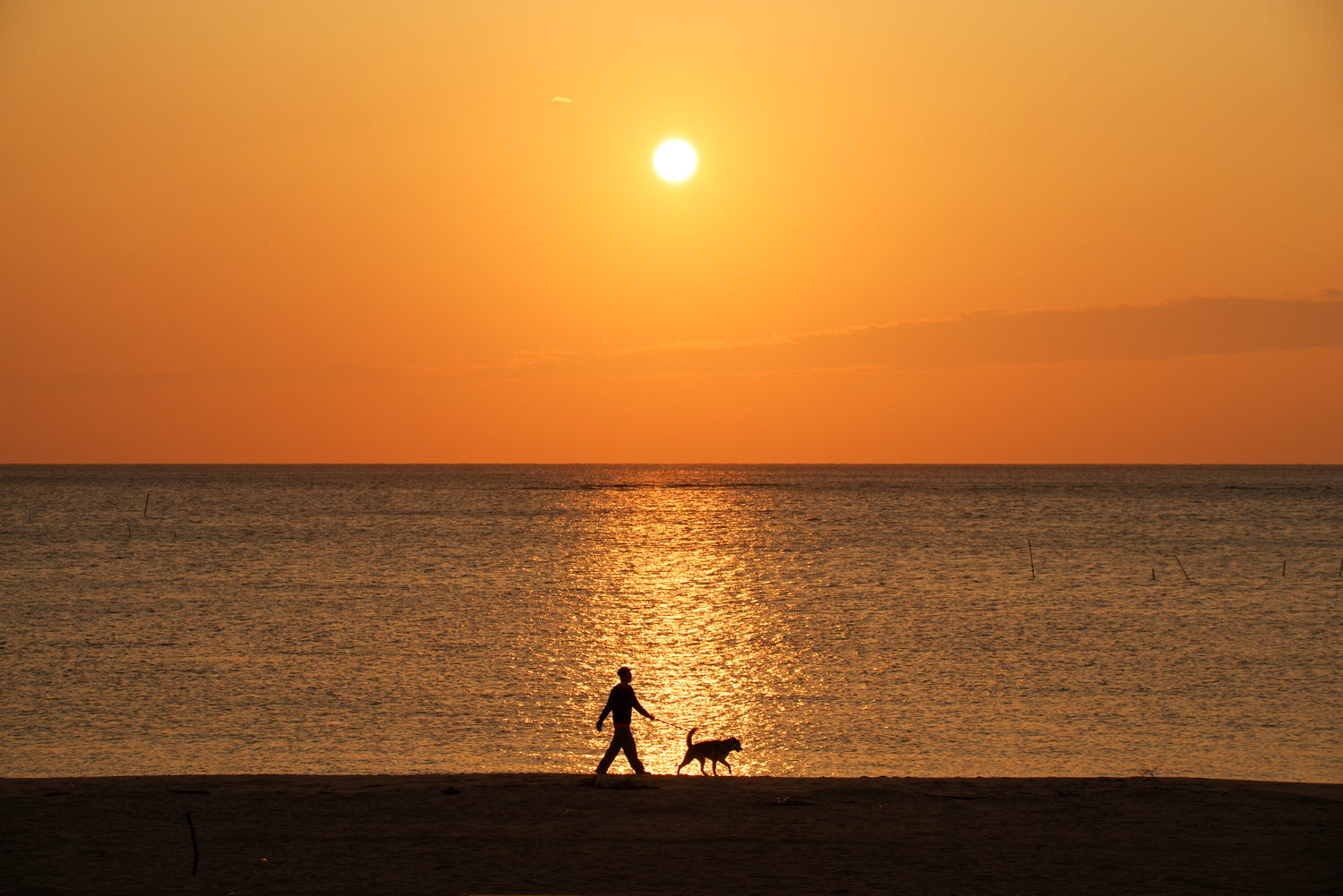 沖縄のビーチで夕刻に愛犬を連れて散歩を楽しむ人