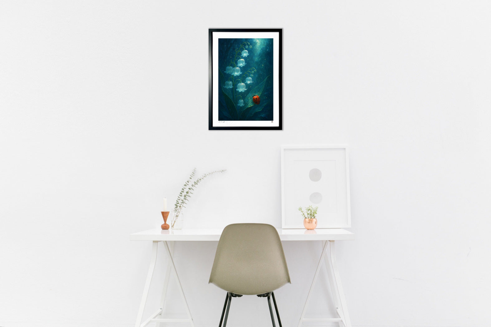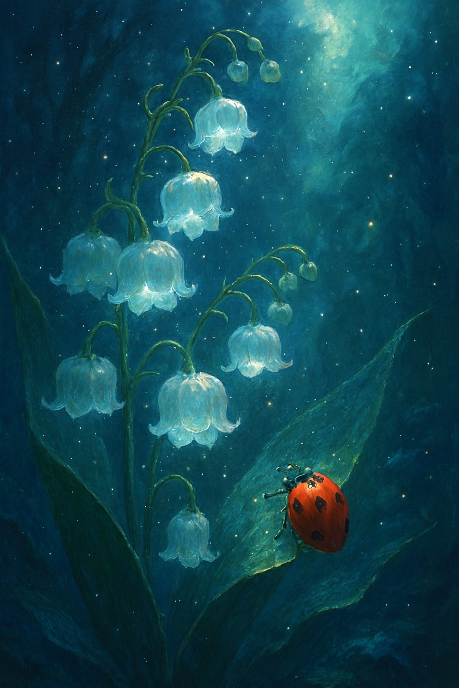 朝露がまだスズランの鈴に残る静かな森で、一匹のてんとう虫がそっと花の影に身を寄せていた。