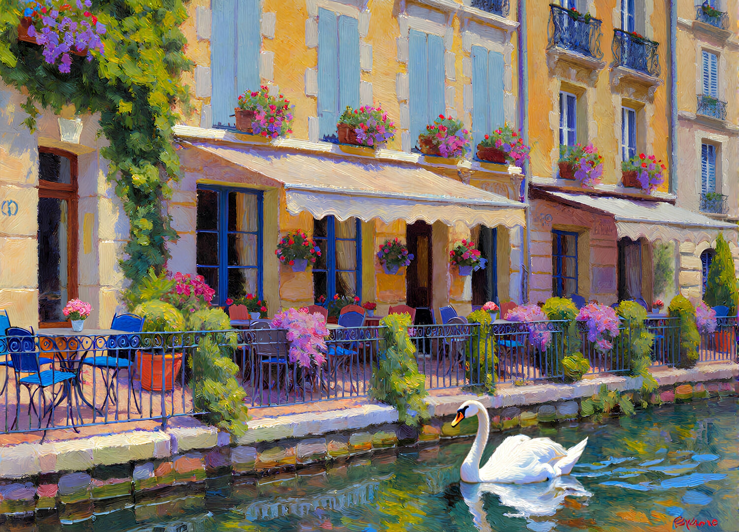 川沿いのレストランのテラス席の風景。