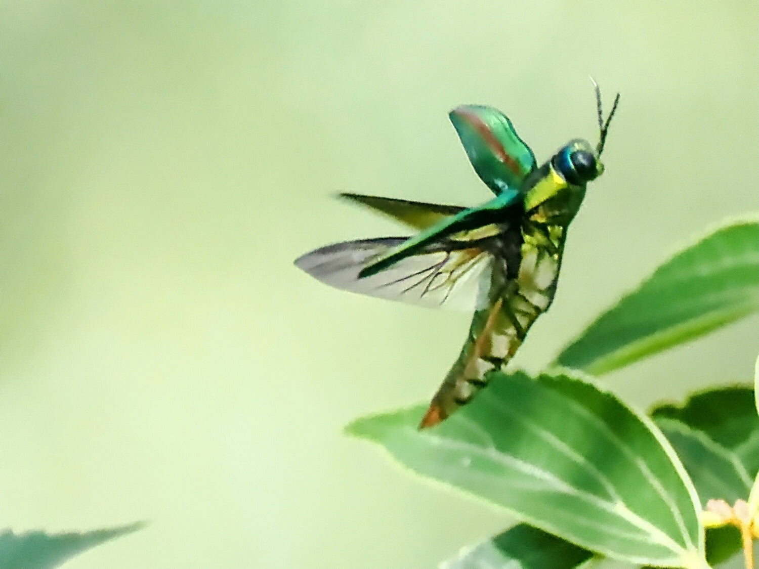 エノキの樹冠部を飛ぶタマムシの写真です。