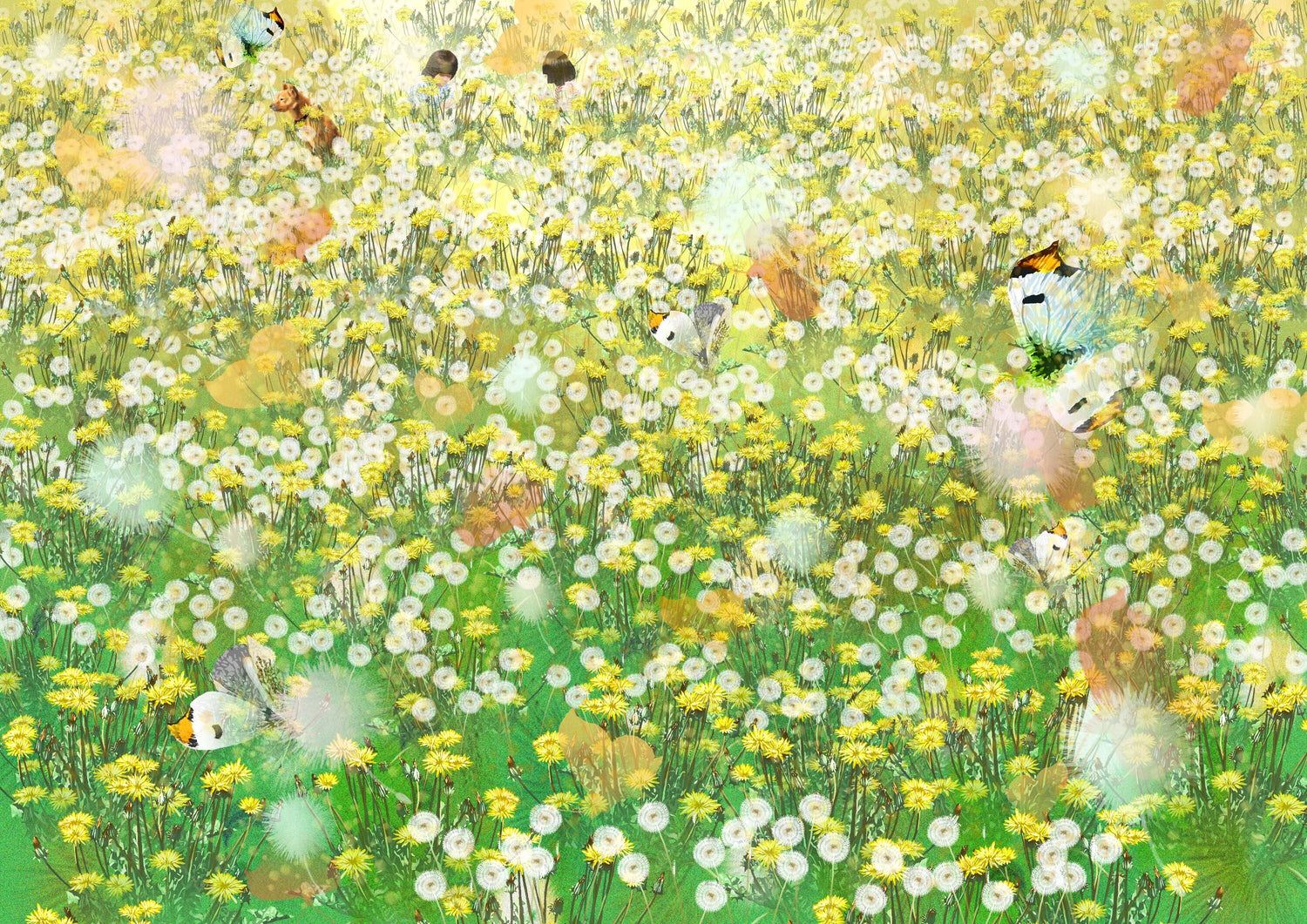 長閑な春、優しい日差しの下、ツマキチョウの飛ぶ一面に広がるタンポポの野原でのんびりと姉妹が遊んでいます。