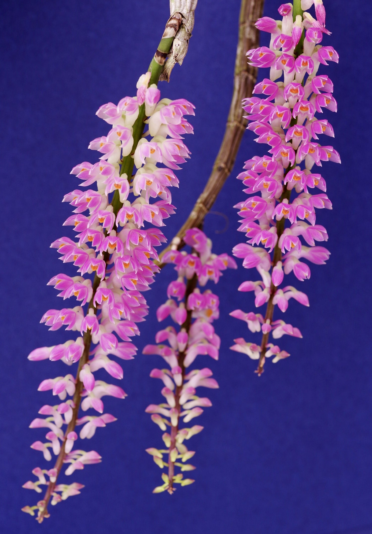 デンドロビューム セッコク属のラン科植物の一つで 赤紫の細長い花を花軸沿いに密集してつける。ミャンマーからインドシナ、スマトラ、フィリピンにかけて分布する。
