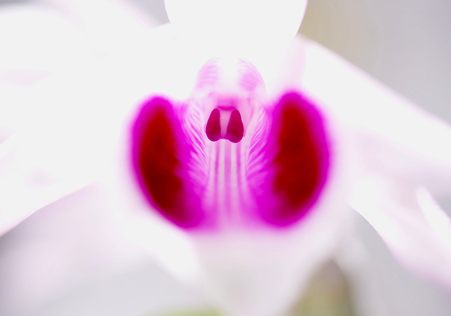 デンドロビューム パリシー 白い花弁にリップの赤紫の模様が 美しく映える。花を図案的にとらえて マクロレンズで撮ったものです。
